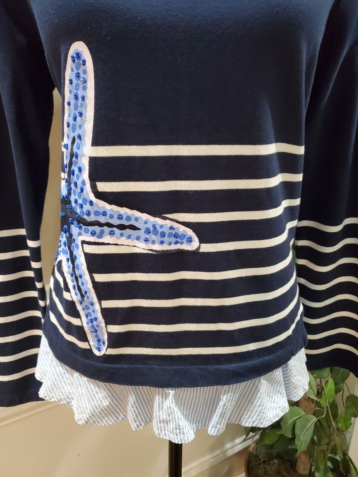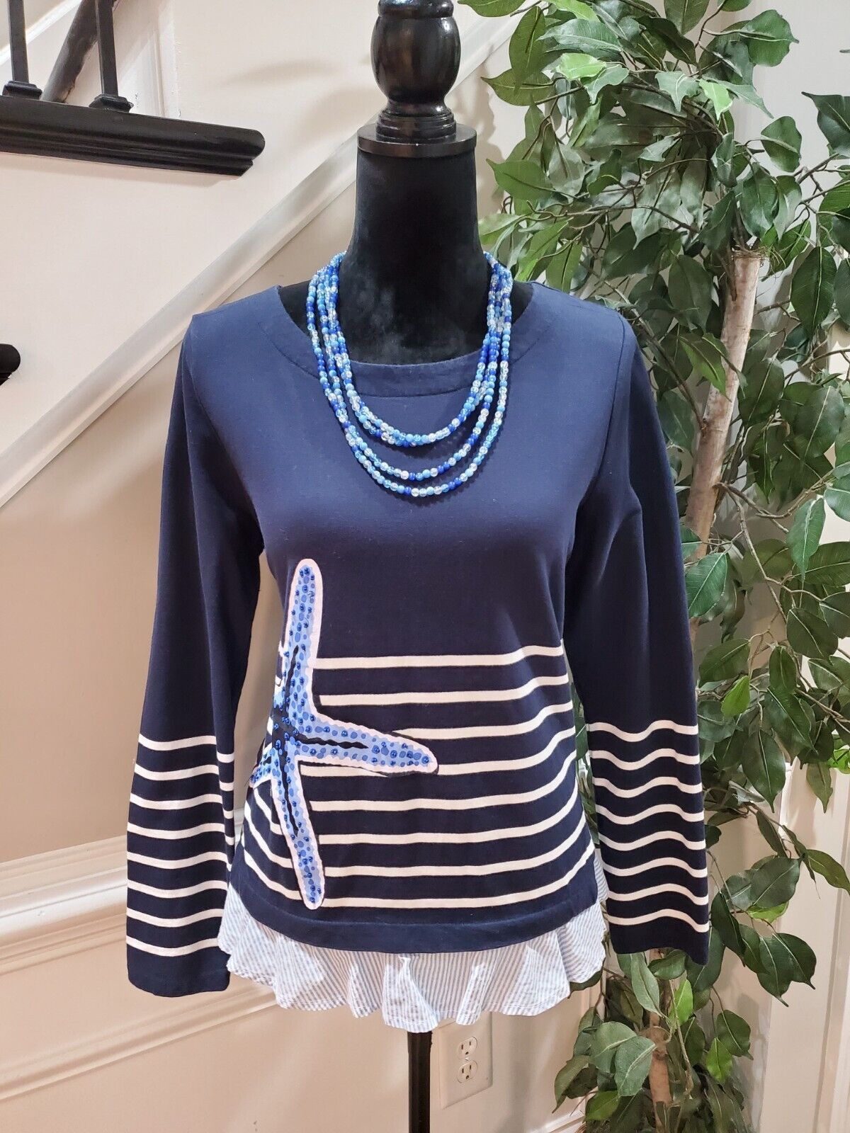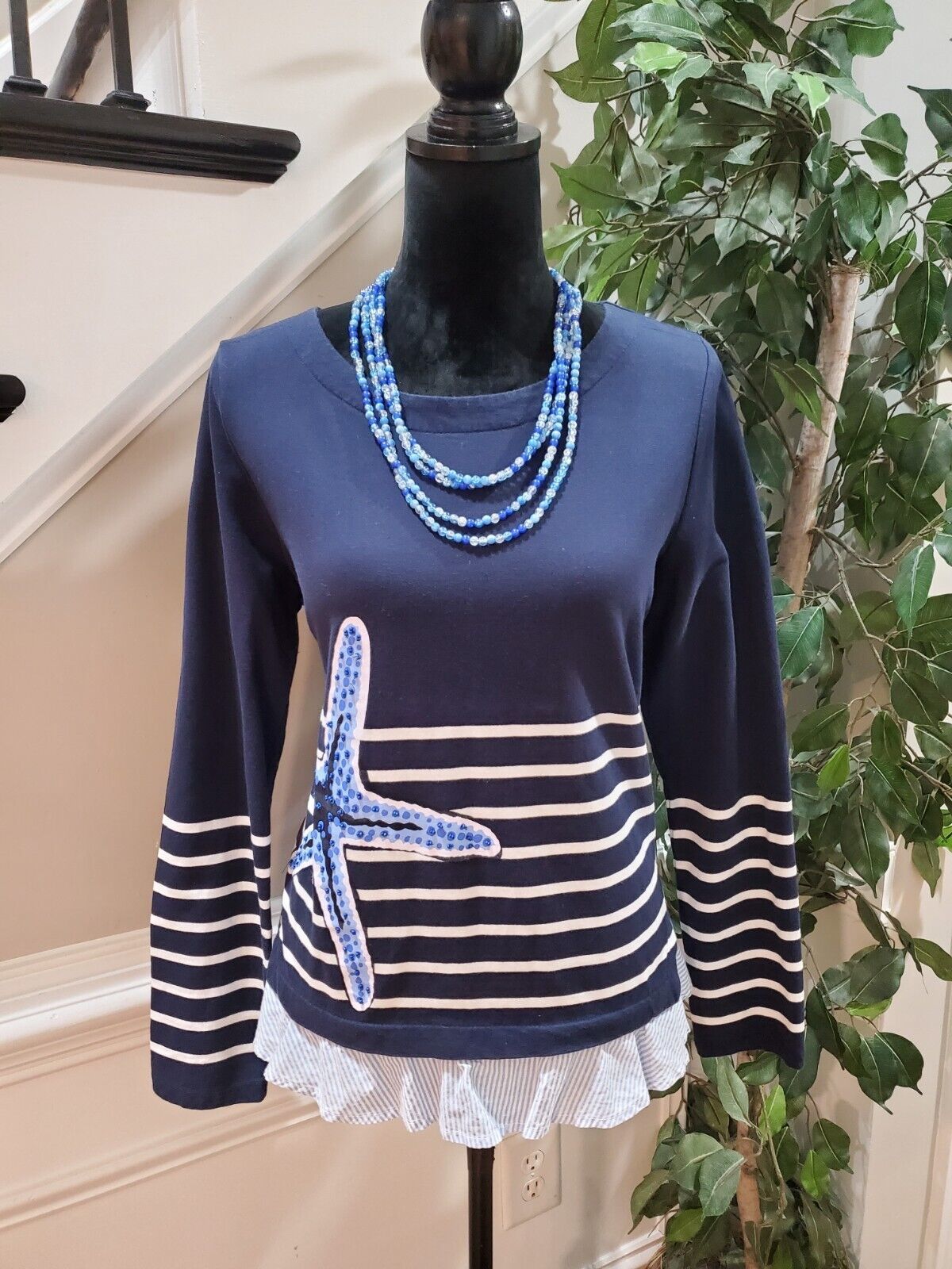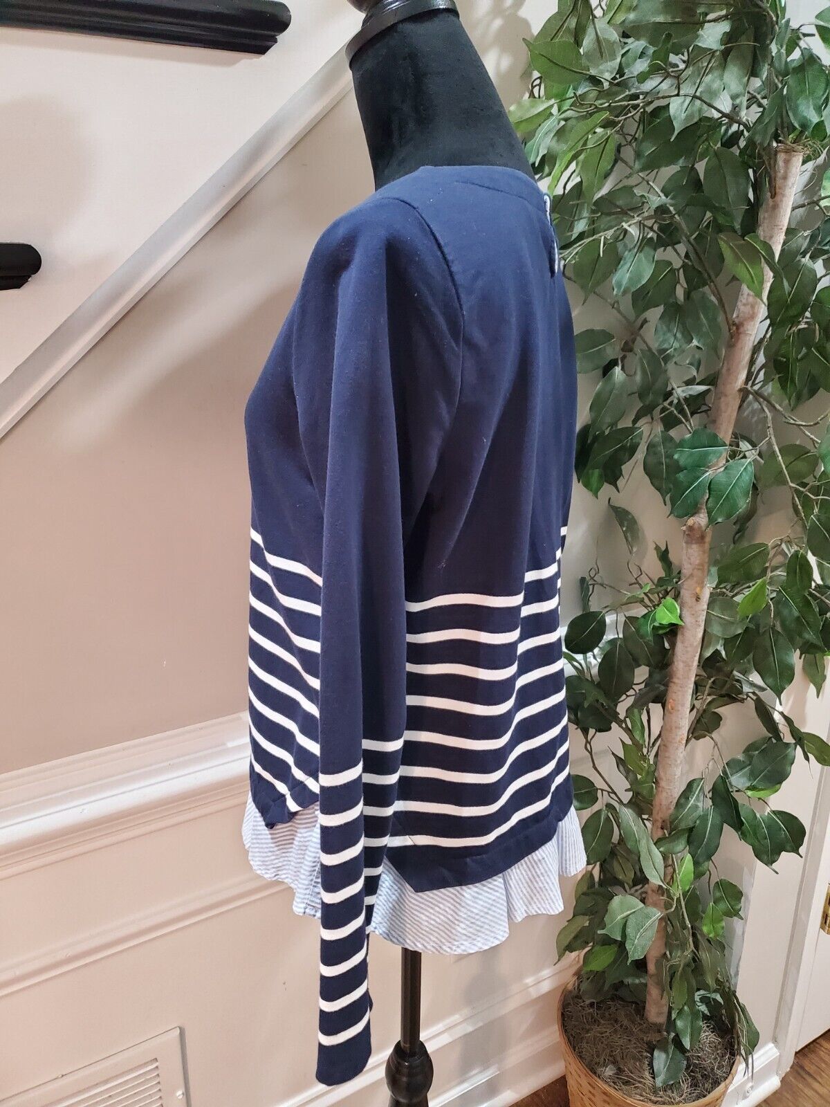 Crown Ivy Womens White Navy Striped Beaded Round Neck Long Sleeve Top Blouse M.