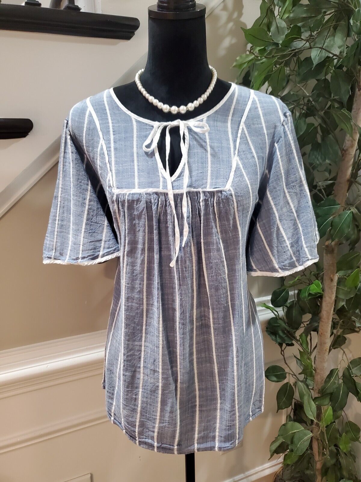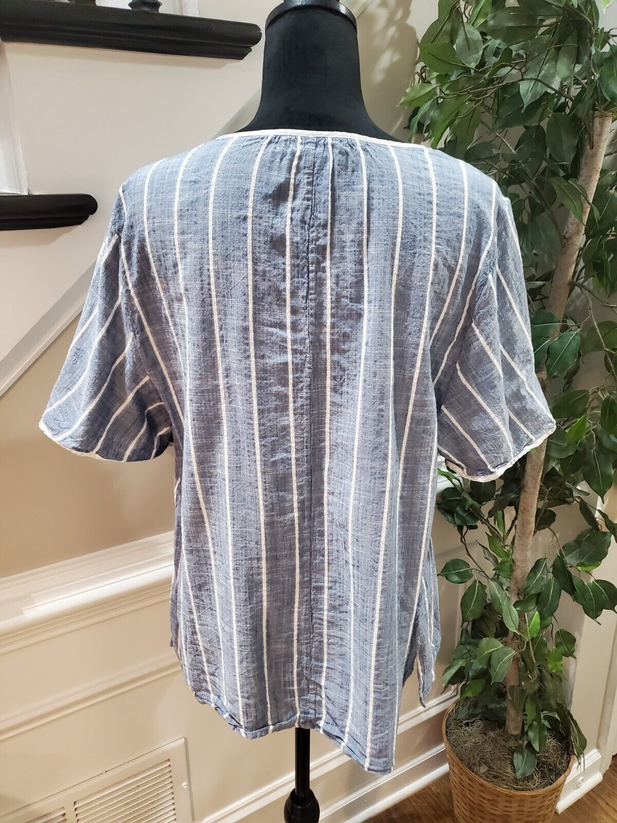 Lane Bryant Women Gray Striped V Neck Short Sleeve Drawstring Top Blouse Size 18