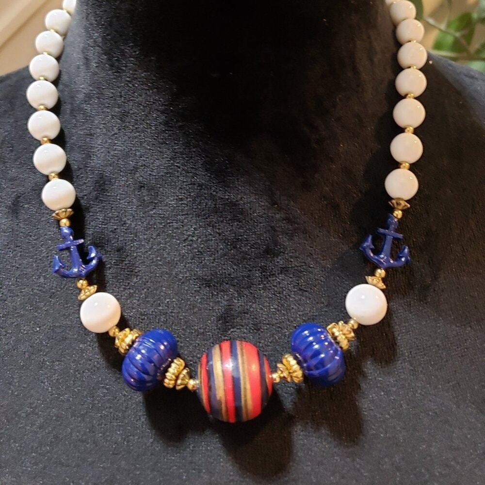 Womens Fashion White Pearl Blue Bead Anchor Collar Necklace with Barrel Clasp.