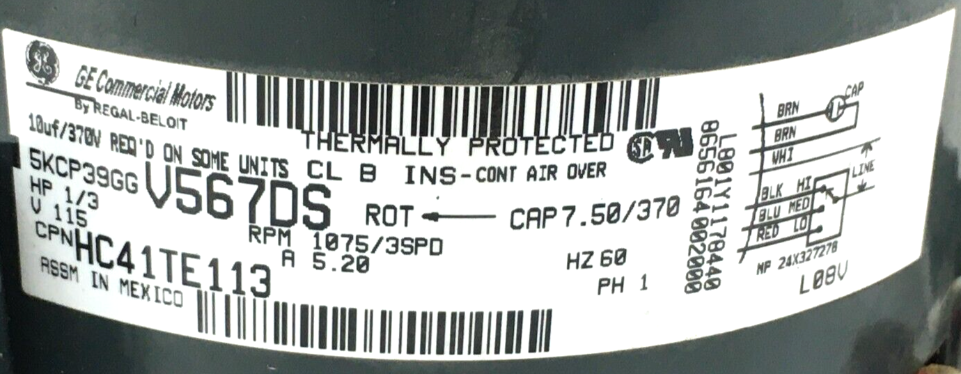 GE Motors 5KCP39GGV567DS Blower Motor 1/3HP 1075RPM 3SPD 115V HC41TE113 #MC644