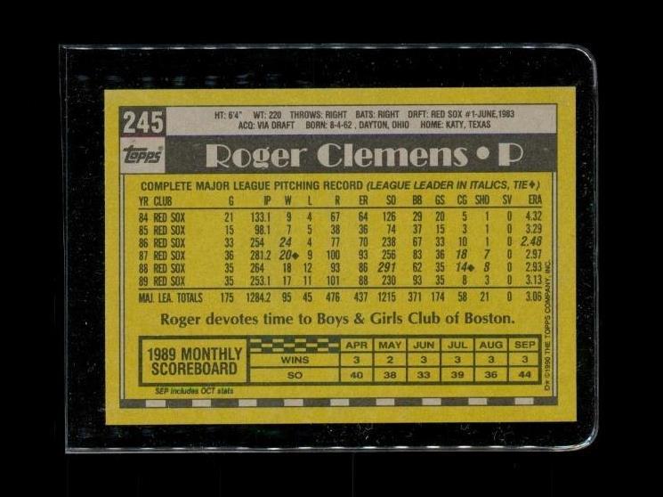 Vintage 1990 Topps Baseball Card #245 Roger Clemens Boston Red Sox. Raw and ungraded. No smoke or pet odor.