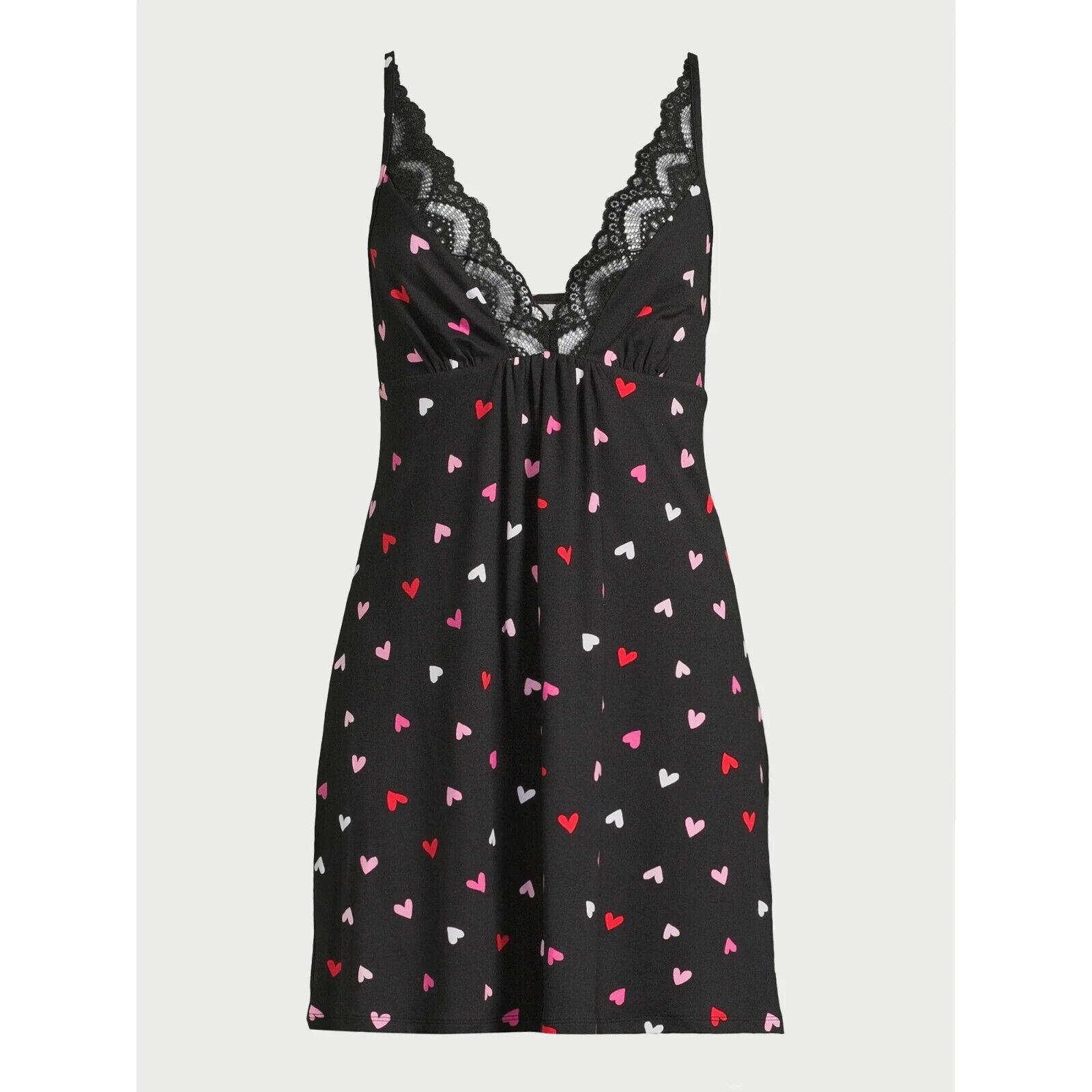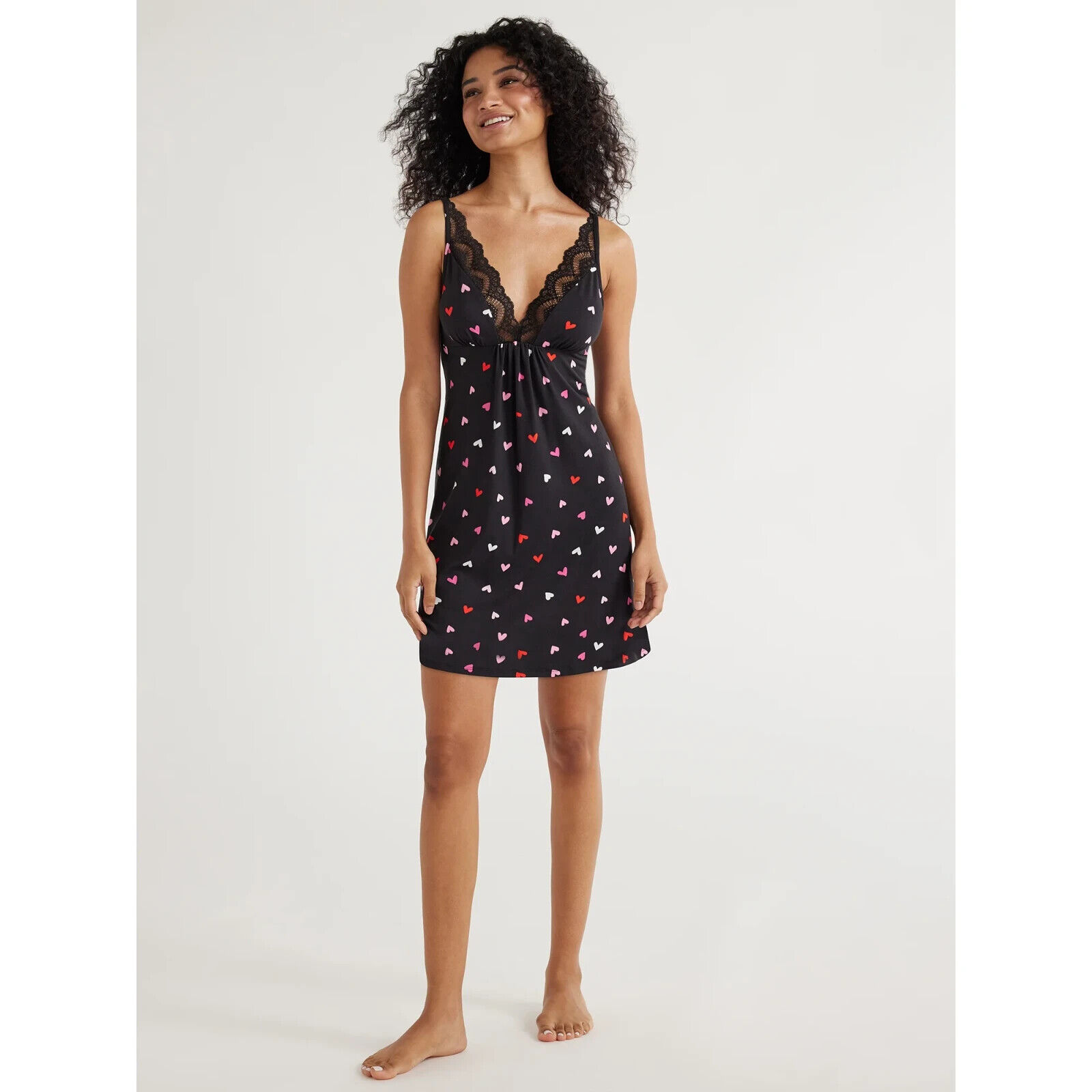 Joyspun Women’s Printed Lace Front Knit Chemise, Black Size 2X(18W-20W)
