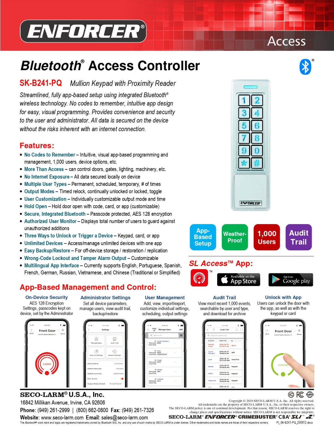 Seco-Larm SK-B241-PQ ENFORCER Bluetooth Access Controller Mullion Keypad with Proximity Reader, User Customization, Administrator Setting, On-Device Security, Easy Backup/Restore, App-Based Programming, Authorized User Monitor, Tamper Alarm Output, Multilingual App Interface, Hold Door Open with Code or app, Three Ways to Unlock or Trigger a Device, Unlimited Devices, Weatherproof (IP65)