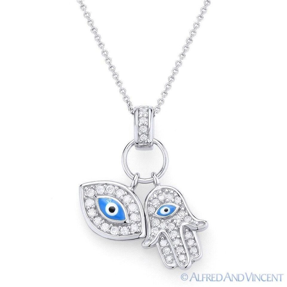 The featured pendant is cast in rhodium-plated .925 sterling silver and showcases a hamsa hand eye charm set with cubic zirconia crystals evil eye beads dangling from a circle cz encrusted bail.