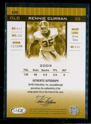 2010 SAGE Hit Silver Auto Rennie Curran #A35 RC Football Card University Georgia