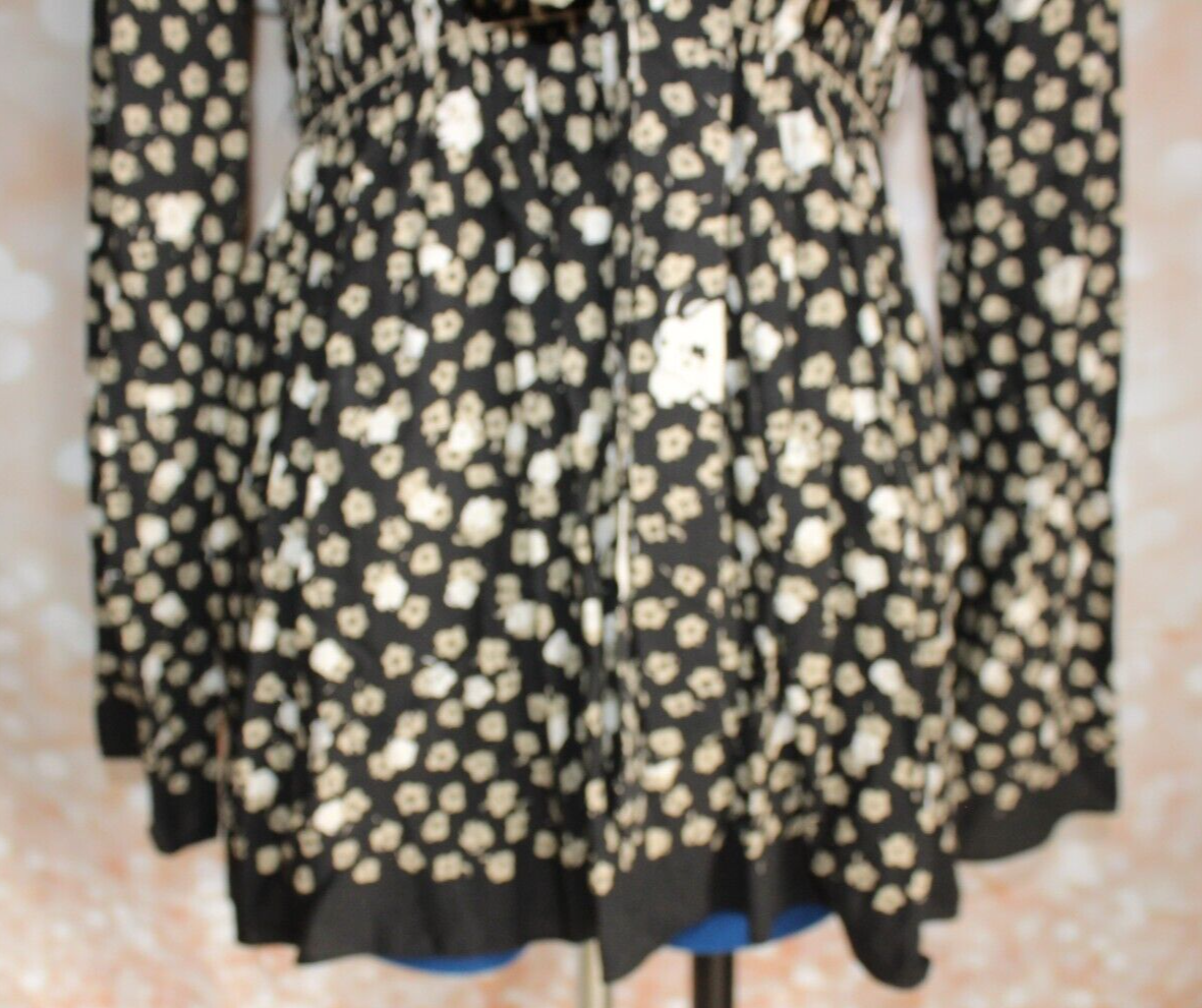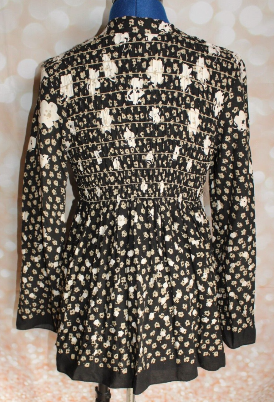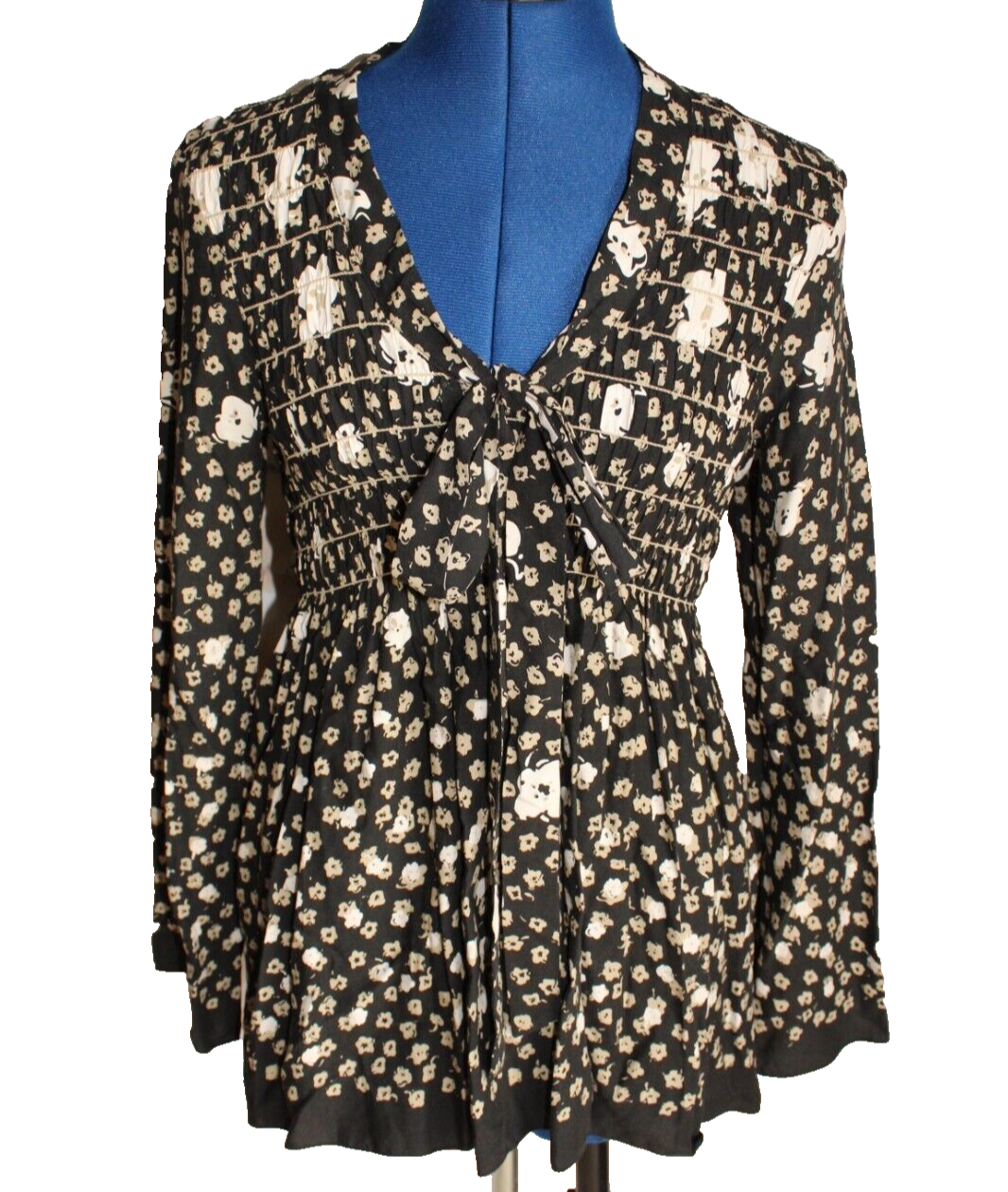 Studio M Womens Blouse Black Tan Floral Long Sleeve Flare V Neck Shirred ~Small~