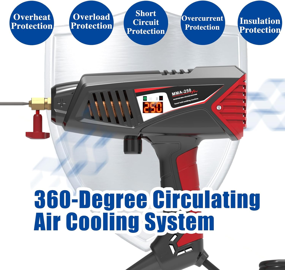 ?20-250A Wide Adjustable Current Range? The welder machine 110V is equipped with the advanced IGBT inverter technology, utilizing Pulse Width Modulation (PWM) control and high-frequency switching to precisely shape the output waveform. The current rotary switch, easily operated with one hand, allows seamless adjustment within the 20-250A wide current range, and it features a digital display screen, enabling precise control of output current and voltage. This contributes to improving welding quality, reducing impurities and defects, catering to the demands of various welding tasks.