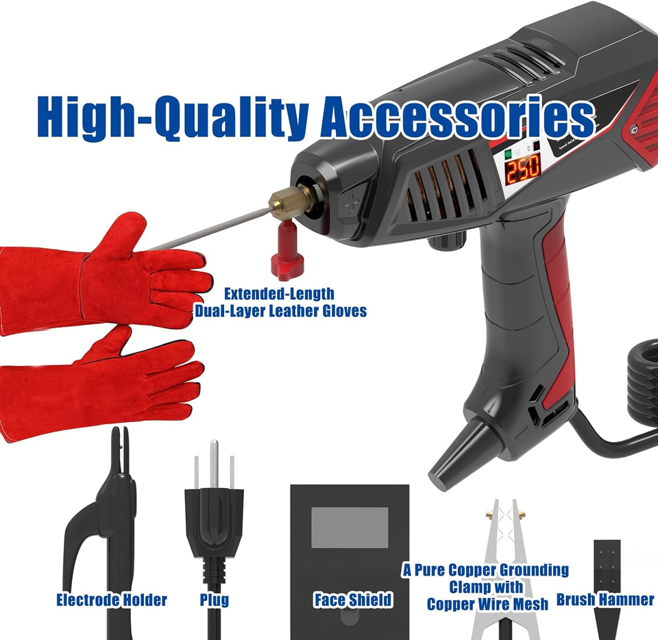 ?Easy Operation, Wide Applications? This hand held welder is easy to operate, suitable not only for professional welders but also for welding beginners. It finds widespread applications in automotive maintenance, DIY projects in the toolshed, sheet metal processing, mechanical manufacturing, and more. The high-quality accessories included with this welding gun, such as 30 PCS E6013 welding rods, extended-length dual-layer leather gloves, a pure copper grounding clamp with copper wire mesh, electrode holder, brush hammer, face shield, and an exquisite carrying case, make it an excellent addition to your repair toolkit!