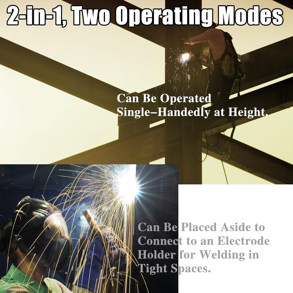 ?Compact and Portable, Two Operating Modes? Our hand held welder gun is lightweight, compact, and comes with an exquisite carrying case for easy storage and portability. This portable welder gun can be operated single-handedly, or it can be placed aside to connect to an electrode holder for welding. Holding the portable welding gun for welding is convenient for high-altitude operations, while putting down the handheld welder gun and using the electrode holder is convenient for working in tight spaces. With these two operating modes, we aim to deliver an enhanced welding experience.