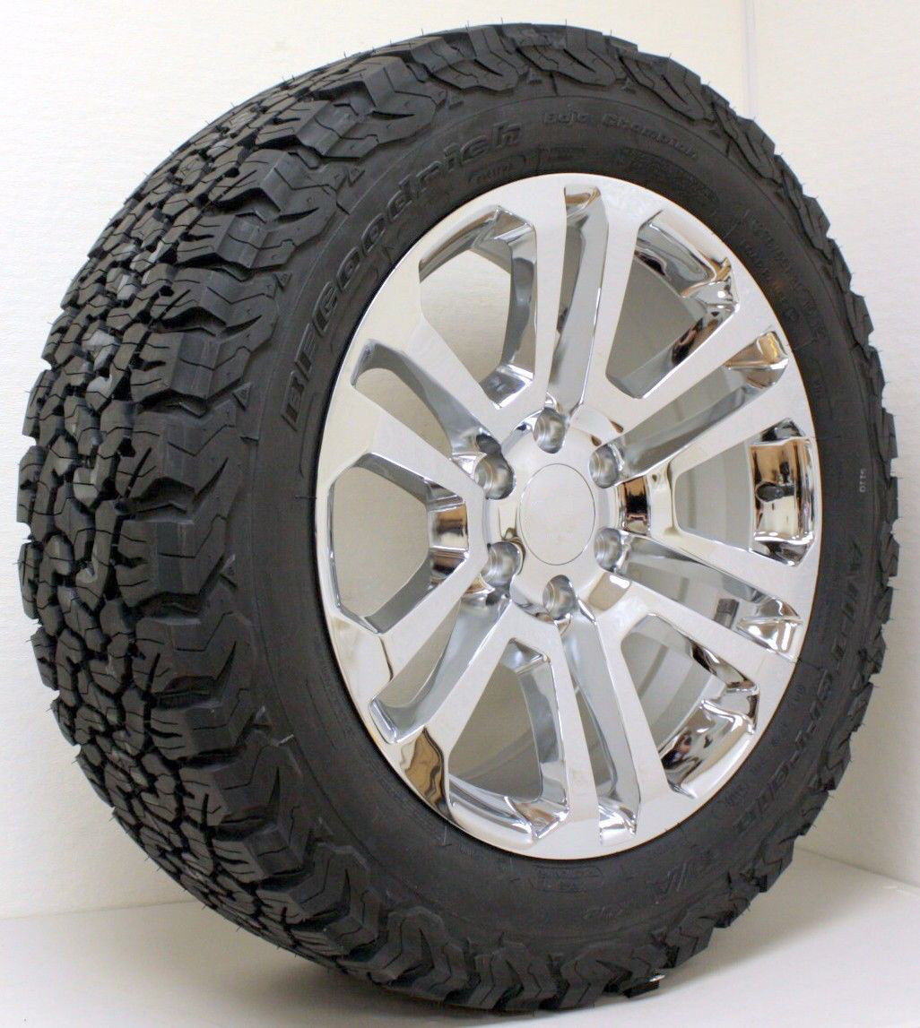 FREE SHIPPING!!! For Questions Contact DB Wheels and Tires Please Refer To Item 303155550573 New set of Four 20 inch GM Style Replica Split Spoke Chrome wheels with new LT275/60R20 BFGoodrich KO2 A/T tires, includes Lug Nuts and TPMS Sensors. Will fit stock suspension of 2014-2024. Older model trucks will need a leveling kit for clearance.