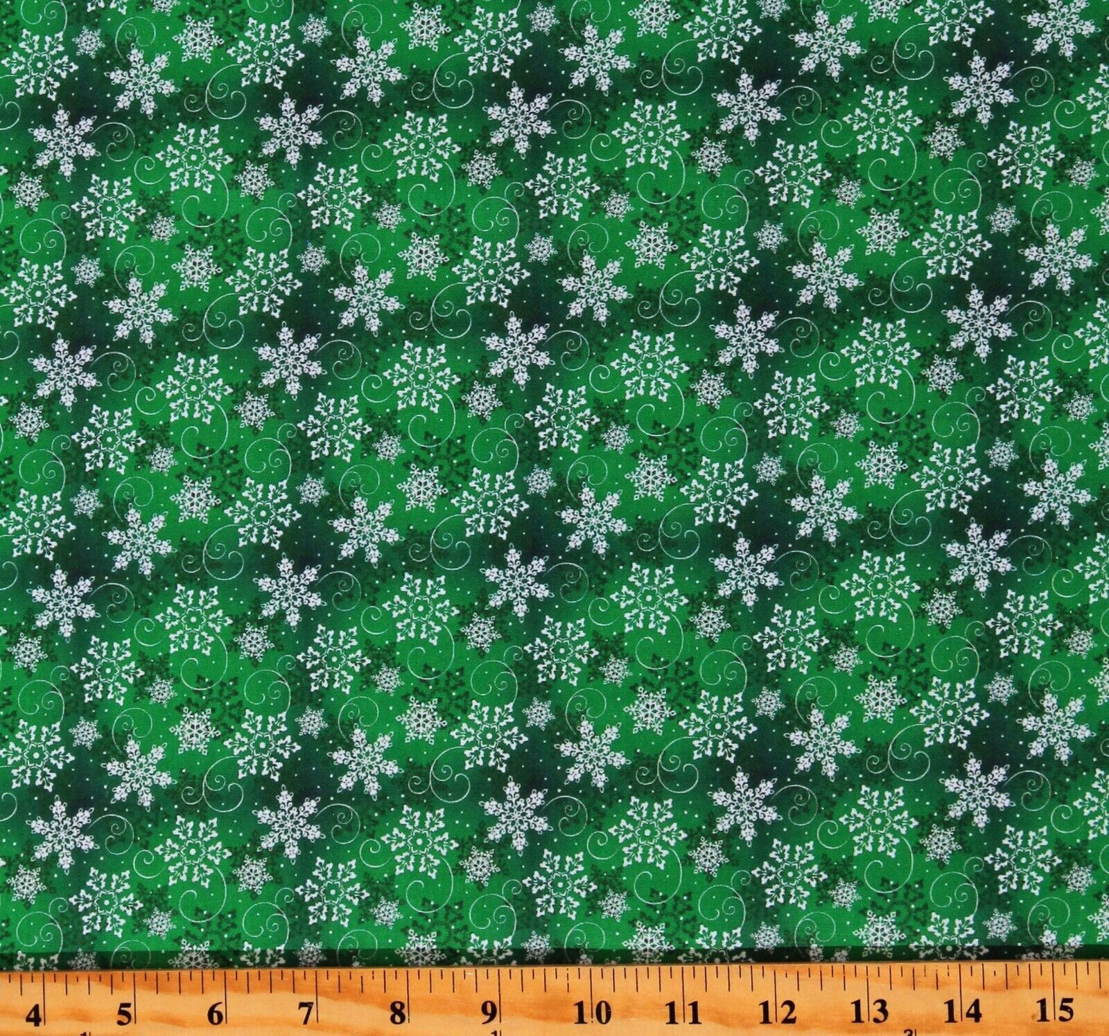 Cotton Christmas Snowflakes Snow Swirls Dots Green Fabric Print by Yard D406.56