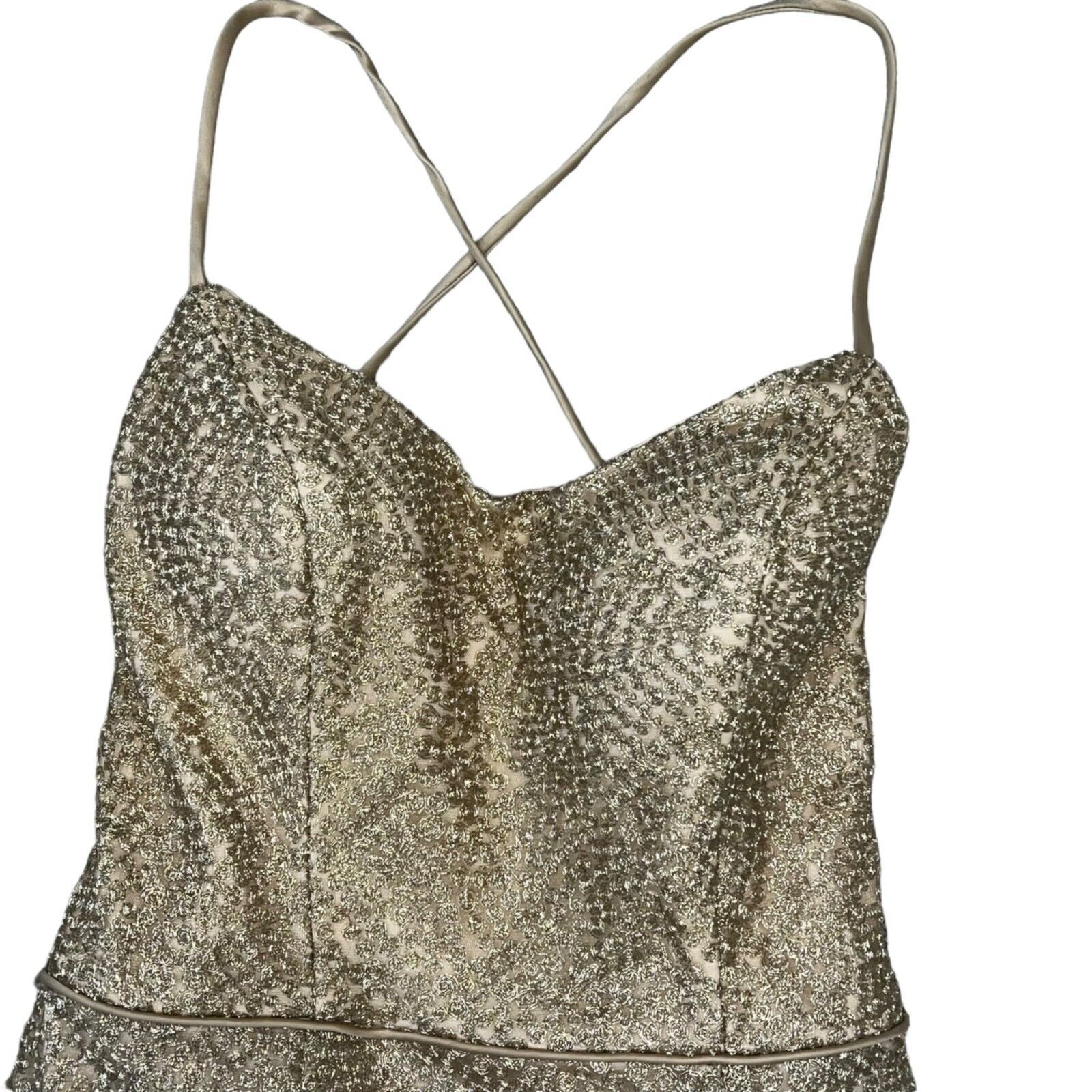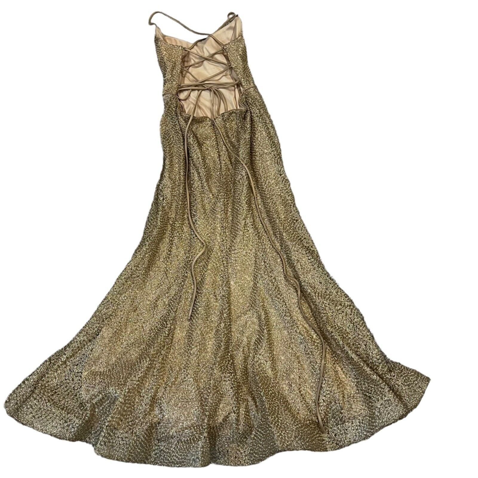 This Camille La Vie size 14 dress in gold features a corset back, full length, strappy style. It's perfect for upscale occasions, offering a glamorous, sophisticated look.