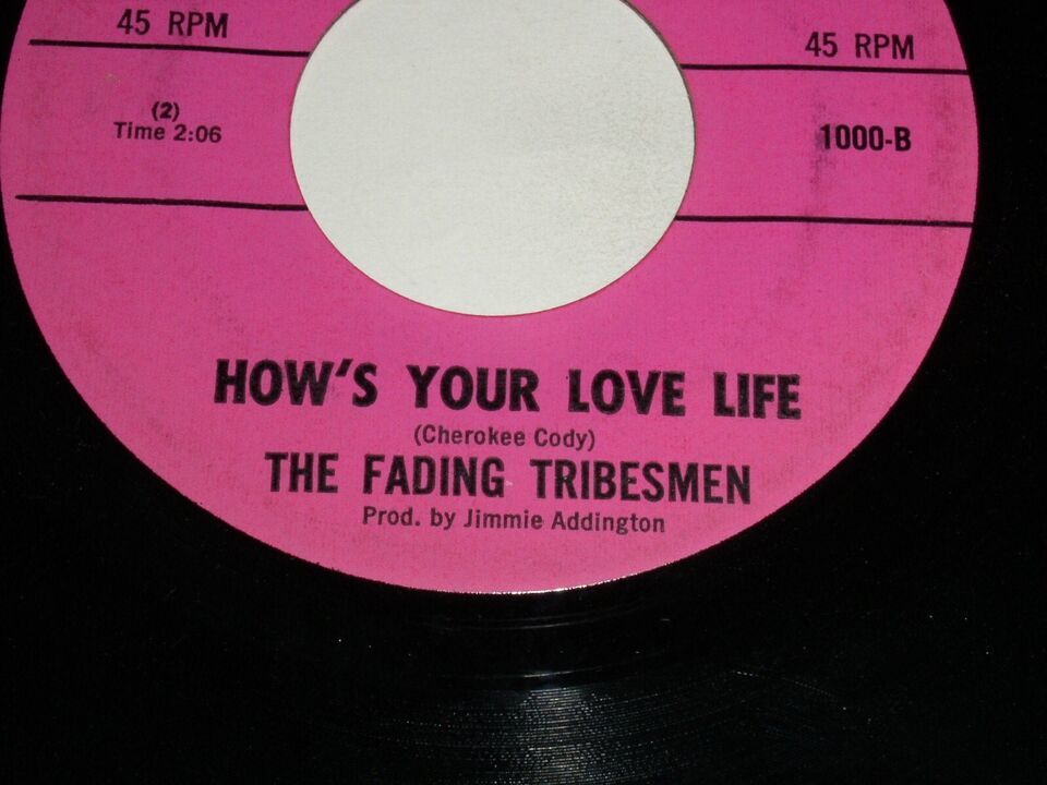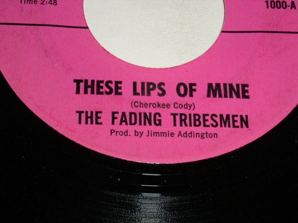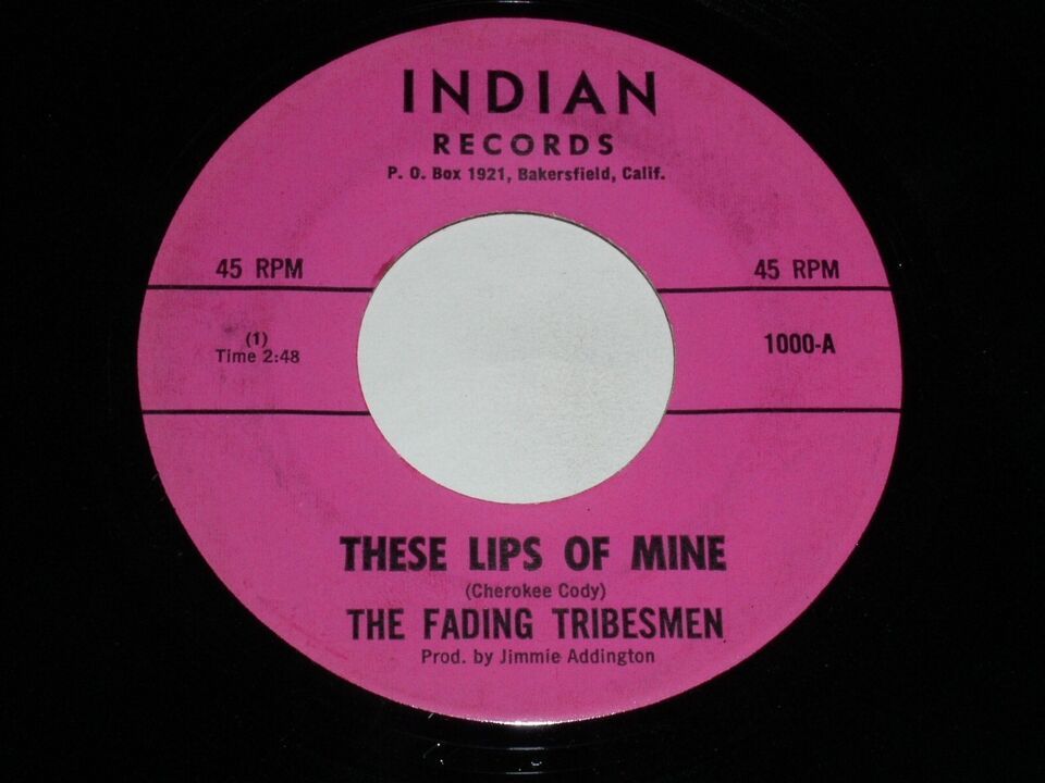 This is an original, vintage 45 rpm phonograph record by The Fading Tribesmen, entitled, "These Lips Of Mine". Flipside: "How's Your Love Life". Record label: Indian Records 1000. ***Note: This is not the Pink Poodle label reproduction. It is vintage and original. It has never surfaced for sale and could be the only one in existence, but uncertain.