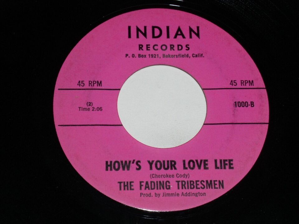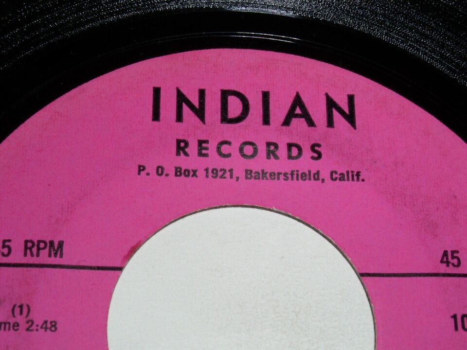 Research on this 45 took me to the song titles being from a band named, Chief Big And The Scalp Hunters on the Turquoise label. The song is definitely Country/Western. This Indian label 45 has the same titles as the Turqoise label 45 but sounds like a different band. The photo of the Turquoise 45 is online and copyrighted, so I can't legally show the comparison of the two. The Turquoise label and Indian label are both Cherokee Cody/Jimmie Addington records. The Bakersfield address is also the same.
