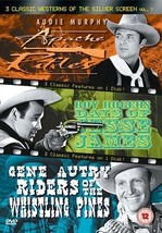 In 'Apache Rifles' (1964), army commander Captain Jeff Stanton (Audie Murphy) is sent to an Arizona army outpost to capture a band of Apache renegades who have been slaughtering local settlers. Stanton has always depised Native Americans, but is forced to radically change his feelings when he falls in love with a beautiful missionary girl (Linda Lawson) and finds out that one of her parents is an Apache. He then has to prevent greedy gold-seekers trying to start a war with the local Apaches. Roy Rogers stars in 'Days of Jesse James' (1939) as a bounty hunter hired to track down the famous outlaw (played by Donald Barry) after a bank robbery. After infiltrating Jesse's gang, Roy learns that James might well be innocent of the charge - and decides to set a trap for the real robbers. In 'Riders of the Whistling Pines' (1949), trees are being destroyed by a devastating parasite and the lumber company stands to lose millions. When a Forest Ranger is shot, Gene Autry and his former army buddies who are also foresters are called in to help save the forest. However, the evil loggers frame Autry for the crime and their devious plan continues when they spray the forest to kill the insects, yet wind up killing much of the wildlife, too. Autry must prove his innocence and bring the guilty men to justice. Please note this DVD is region 2 and will only work in the following regions Japan, Europe, South Africa, the Middle East (including Egypt) and Greenland, Unless you have a multi-regional DVD Player.