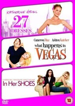 Triple bill of 'chick flicks'. '27 Dresses' (2008) is an upbeat romcom about a woman who's always the bridesmaid, never the bride. Jane Nichols (Katherine Heigl) has led a selfless, romantic life, always putting others needs first and herself last, especially when it comes to marriage. With 27 bridesmaid dresses in her cupboard, Jane is beginning to see a pattern developing. Scuttling between receptions one evening, she's spotted by a cynical local reporter (James Marsden) who sees her story as the ideal vehicle to move up the career ladder. But when her younger sister, Tess (Malin Akerman), makes moves on her boss, George (Edward Burns), who she secretly adores, Jane finally realises it's time to grab her life by the horns before it's too late. Cameron Diaz and Ashton Kutcher star in 'What Happens in Vegas' (2008) as Joy and Jack, two strangers who spend a drunken night together in Las Vegas only to wake up the next morning to discover that they've married each other. To make matters worse, Jack wins the $3 million jackpot on a slot machine after playing Joy's quarter. Unwilling to come to an agreement over the money, they go to court where the judge freezes the cash and orders them to work on their marriage for six months. The newlyweds begin devising schemes to undermine each other and get their hands on the money, only to find themselves falling in love despite the mutual backstabbing. 'In Her Shoes' (2005) is a comedy drama about two sisters with nothing in common except size 8-and-a-half feet. Maggie (Cameron Diaz) and Rose (Toni Collette) Feller are both best friends and polar opposites when it comes to values, goals and personal style. Maggie is a party girl who barely graduated from high school, recycles jobs as quickly as yesterday's newspapers and believes her biggest asset is her attractiveness to the opposite sex, while Rose (Toni Collette) is a Princeton-educated attorney at a top law firm who struggles constantly with her weight and never feels comfortable in the clothes she wears. After a calamitous falling out, the two sisters travel a bumpy road toward true appreciation for one another - aided along the way by the discovery of Ella (Shirley MacLaine), the maternal grandmother they both thought was dead. Please note this DVD is region 2 and will only work in the following regions Japan, Europe, South Africa, the Middle East (including Egypt) and Greenland, Unless you have a multi-regional DVD Player.