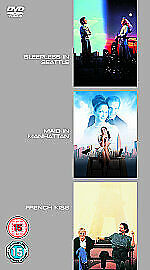 Triple-bill of romantic dramas. In 'Sleepless in Seattle' (1993), Sam Baldwin (Tom Hanks) has lost his wife to cancer and, left to bring up his son alone, tries to make a new start by moving to Seattle. His son turns him into a radio heartthrob, however, when he makes an on-air appeal to potential partners for his grief-stricken father. Annie Reed (Meg Ryan), despite being happily betrothed, answers the call, and romance blossoms between the two people, despite the fact that they live on different sides of the country. In 'Maid in Manhattan' (2002), Jennifer Lopez stars as Marisa Ventura, a single mother who works as a maid in one of New York's top hotels, but has aspirations to do better. Holding her back is her mother (Priscilla Lopez), who thinks she should accept who and what she is and leave it at that. However, after a case of mistaken identity Marisa finds herself being pursued by Chris Matthew (Ralph Fiennes) who is staying at the hotel and is running for the Senate, as a Republican. Egged on by her friends at the hotel and by her son, Marisa decides to accept a date with the dashing bachelor but finds their paths are definitely not the same and she returns to her New York suburb, having lost her man and job. But can love still conquer the social divide? Finally, in 'French Kiss' (1995), Kate (Meg Ryan) is shocked to discover that her fianc? has fallen in love with another woman during a business trip to Paris and resolves to win him back. Arriving in Paris, she has a chance encounter with Luc (Kevin Kline), an annoying but sexy Frenchman who is searching for a missing necklace. Fate conspires to throw the pair together, and they go on an adventure across France, searching for Kate's fianc? and Luc's necklace, where Luc turns out to be more than he admits. Please note this DVD is region 2 and will only work in the following regions Japan, Europe, South Africa, the Middle East (including Egypt) and Greenland, Unless you have a multi-regional DVD Player.