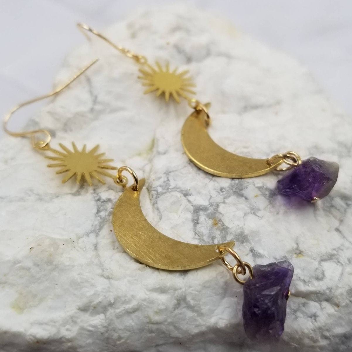 Natural Purple Crystal Celestial Sun And Moon Dangle Earrings
