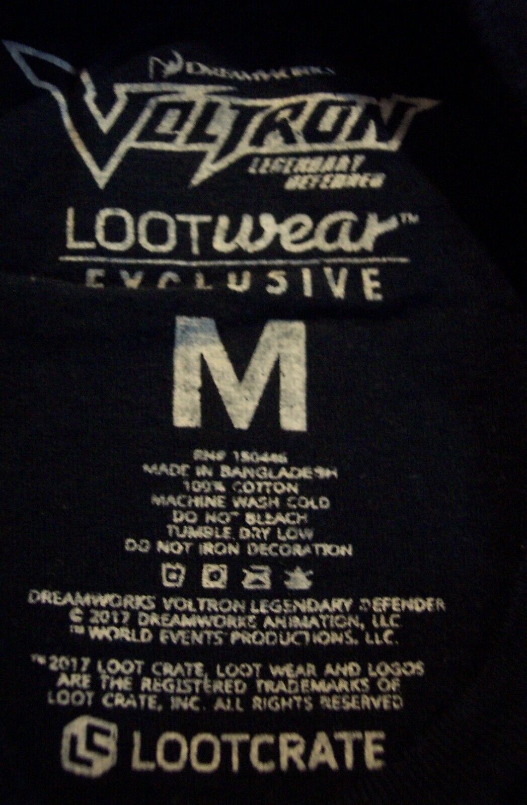 This is a VOLTRON Legendary Defender Loot Crate Exclusive T-shirt. It is a size MEDIUM on the tag, but measures more like a SMALL. It is 20 inches from armpit to armpit and 25 1/2 inches in length. It is in great condition. It is CLEAN! No Stains, Tears, or Defects. 100% Cotton AD