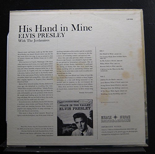 Product description: THIS IS A RECORD ALBUM BY ELVIS PRESLEY CALLED "HIS HAND IN MINE", IT'S ON THE RCA VICTOR LABEL #LSP-2328 IN 'LIVING STEREO'. IT WAS ISSUED IN 1960 WAS HIS 2ND GOSPEL ALBUM. IT CONTAINS A DOZEN GOSPEL TUNES LIKE: "HIS HAND IN MINE, MILKY WHITE WAY, JOSHUA FIT THE BATTLE, JESUS KNOWS WHAT I NEED + WORKING ON THE BUILDING", ETC. ALL SONGS FEATURE ELVIS SINGING WITH THE JORDANAIRES.