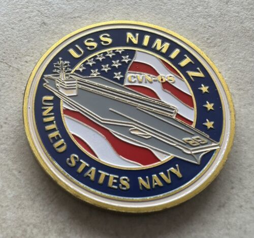 This is a great looking US NAVY - USS NIMITZ CVN-68 commemorative challenge coin. Coin has reeded edges and is about 1 9/16" in diameter. All details are raised lettering. Coin is contained in an acrylic air tight holder.