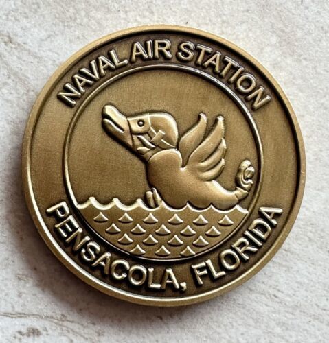 Naval Air Station Pensacola, Florida surrounds the NAS Flying Duck Mascot while the other side features the Uni States Navy Anchor and Eagle crest.