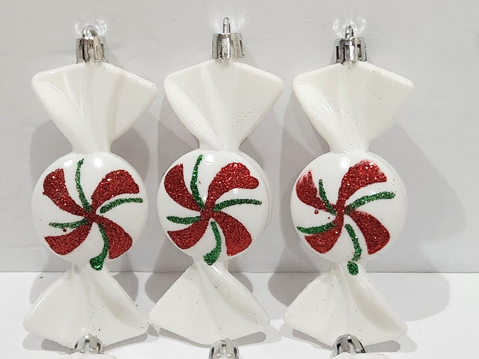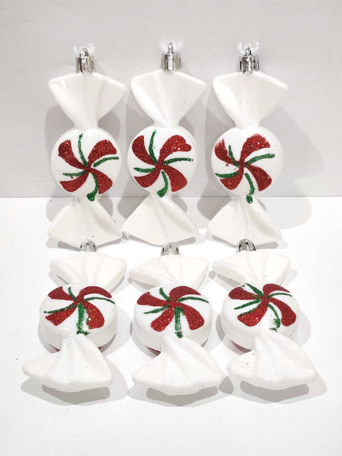 Up for sale we have a set of 6 adorable plastic ornaments for your Christmas tree, Wreath or Garland. These ornaments are so cute they are white with red and green glitter. These measure approx 4.25" including the round tip. These are new but will not come in original box to be able to ship in a smaller box and keep shipping cost down. Please note some of these might has some slight imperfection on the ornaments.