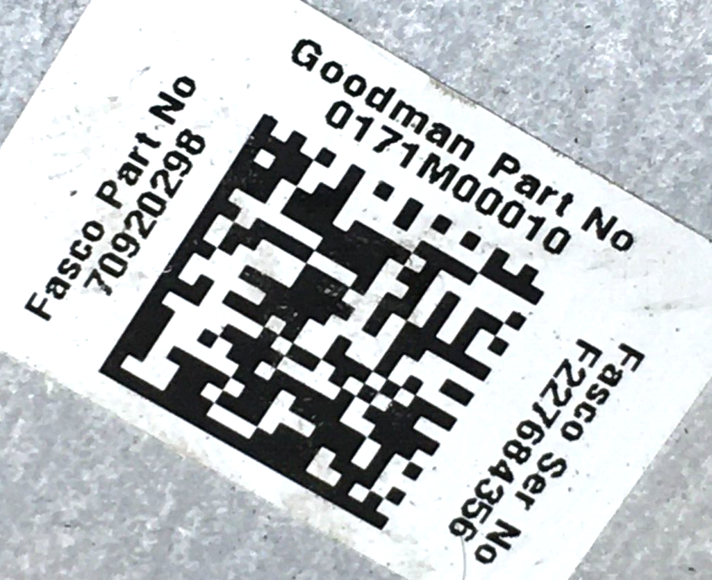 This is Goodman 0171M00010 Inducer Vent Motor Assembly Fasco 70920298 33-110V 1500 - 4700 RPM 60/180 Hz used motor.
