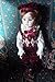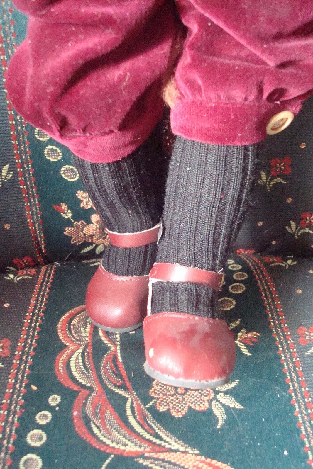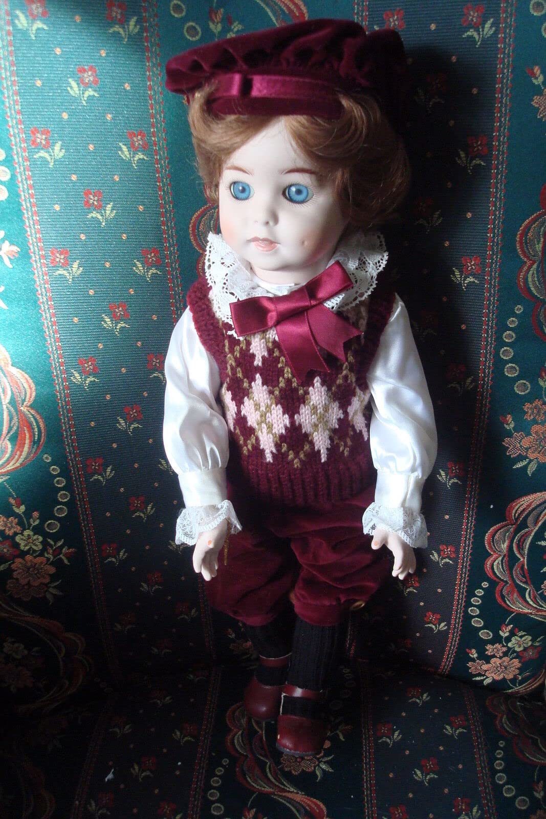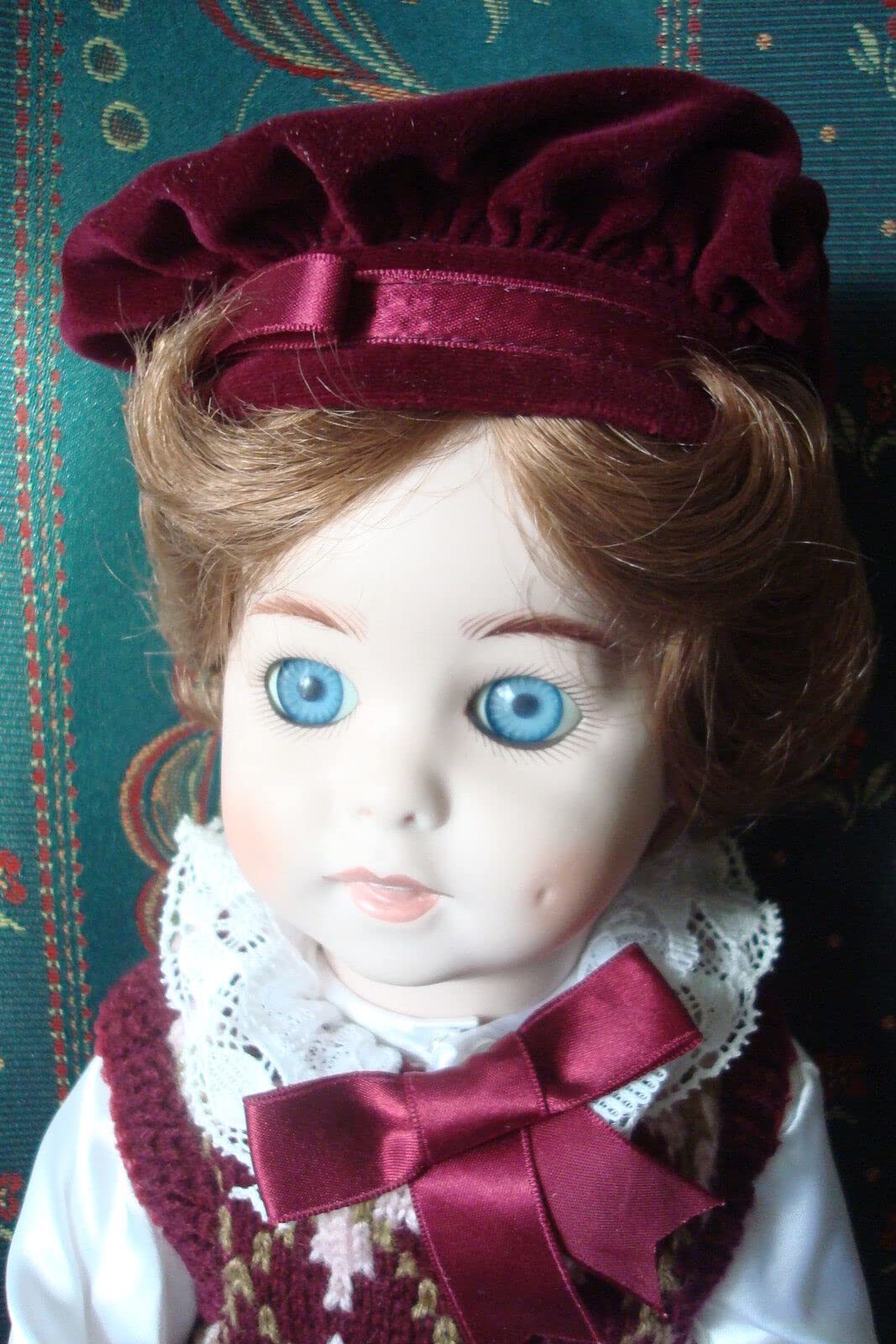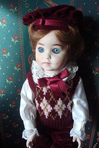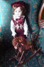Jessy Gorham all ceramic doll with rocking horse, 17" doll, NIB Limited Edition of 1,000 hand numbered pieces, from the "Bonnets and Bows" collection. Signed by Susan Stone Aiken,burgundy outfit, white satin shirt, ruffled collar and leather shoes, sweater. Horse is crafted in wood, leather harness, sized properly for Jessy. Box has wear, no stand Issue price $ 525 [A4RACK12B]