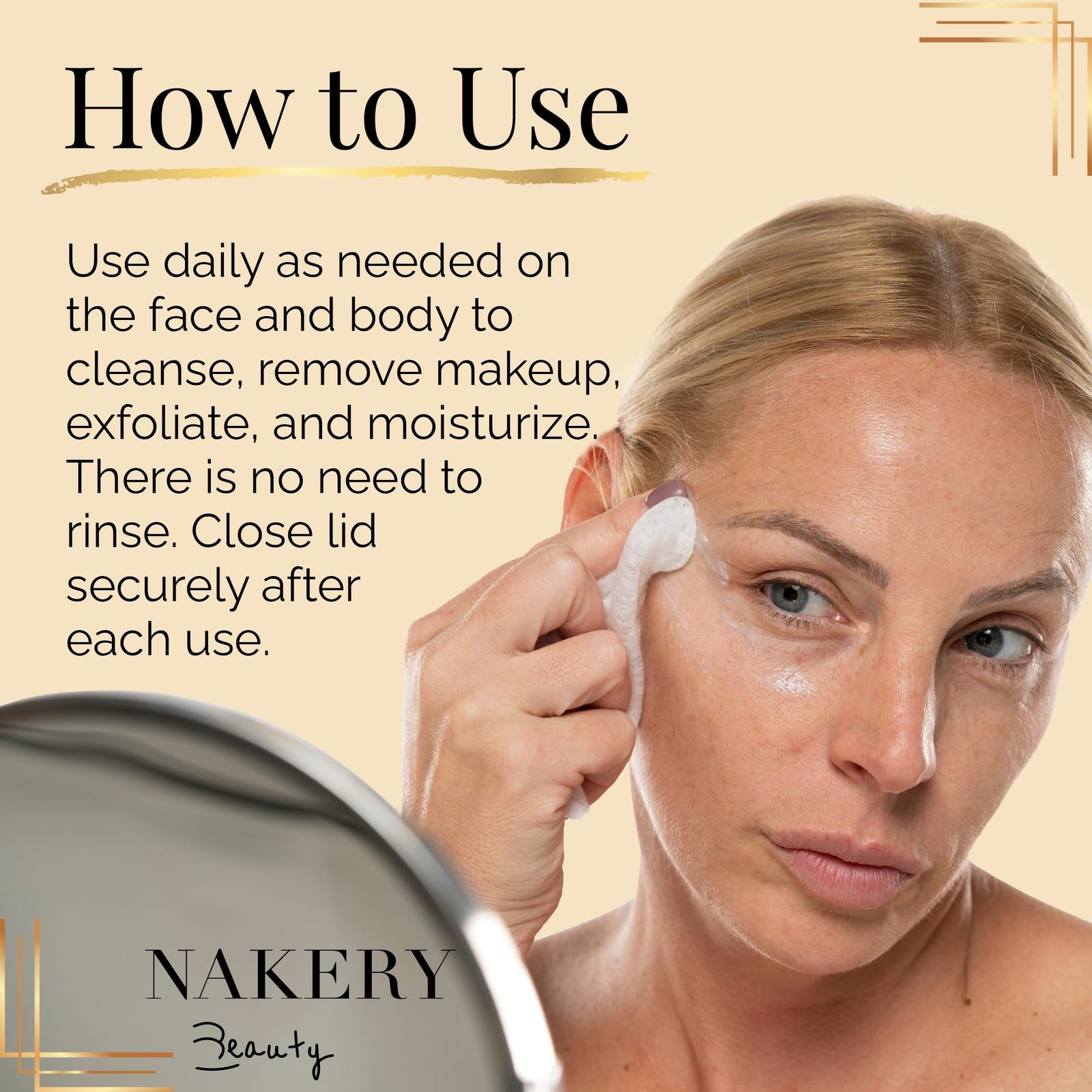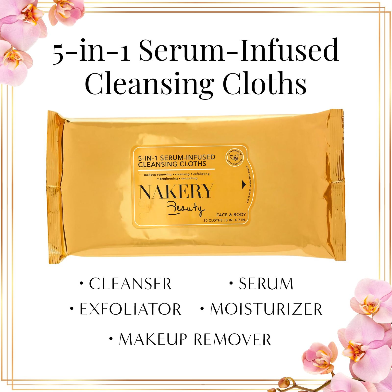 Bullet point: 5-IN-1 SERUM-INFUSED CLEANSING CLOTHS - Nakery Beauty?s cleansing cloth makeup remover combines 5 essential skincare steps into one luxurious experience. Unlike ordinary face cloths, this makeup eraser cloth works as a cleanser, exfoliator, make up remover, serum, moisturizer.