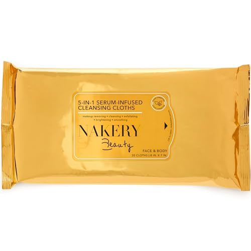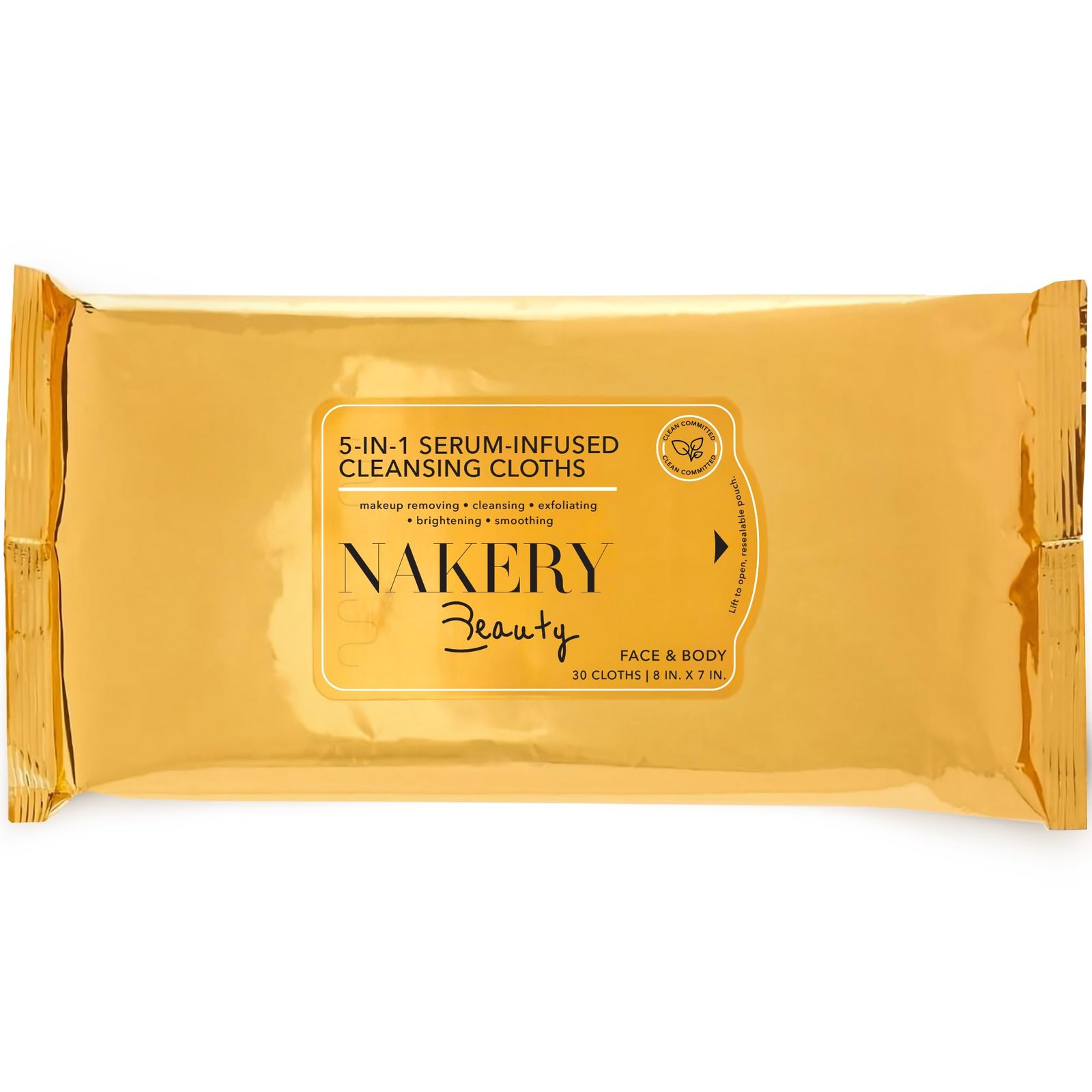 Product description: "Nakery Beauty?s cleansing cloth and makeup remover combine 5 essential skincare steps into one luxurious experience. Unlike ordinary face cloths, this makeup eraser cloth works as a cleanser, exfoliator, makeup remover, serum, and moisturizer. This face cloth and eye makeup remover gently cleanses and exfoliates, improving skin tone and texture. Our makeup remover cloth not only thoroughly removes all traces of makeup but also visibly reduces the appearance of fine lines and wrinkles. This makeup cleaner is infused with a serum-active complex. Aloe vera soothes, hydrates, and moisturizes; Niacinamide regulates sebum production; and triple peptides fight visible signs of aging. This makeup eraser cloth visibly improves the appearance of fine lines and wrinkles, dull, dehydrated skin, uneven skin tone, and rough, textured skin, both temporarily and with continued use. Our all-in-one, easy-to-use face cloths for washing face are also perfect for all over your body."