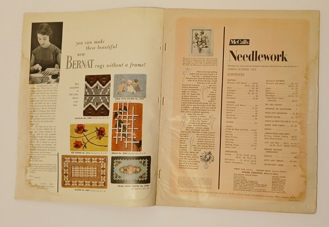 This is an original copy of McCalls Needlework Magazine. This is the Spring/Summer 1955 issue. The cover has minor shelf wear. The pages are clean. There are no missing or torn pages. Pages may have water stains, and or some yellowing due to age. Some edges may be frayed. There is some tearing along the spine.