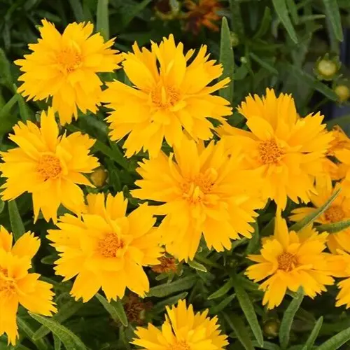 15 seeds of coreopsis grandiflora 'double the sun' also known as tickseed. A dwarf golden double flower with 2.5" blooms that grows to a height of 12-14"tall. It features a long bloom time, is virtually pest resistant and makes a good cut flower.