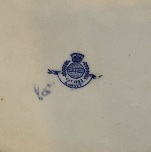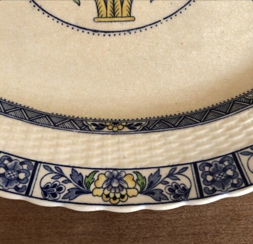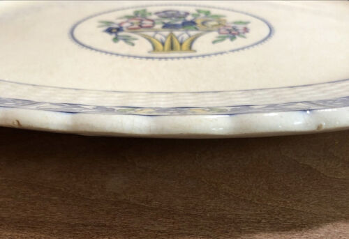 This oval porcelain platter by Minton, is in the Ramsey Blue pattern circa 1920?s and was discontinued in 1928. It has a blue scalloped border with a multi colored floral basket in the center. It measures 13? x10? and weighs about 2 lbs. It is in very good antique condition without cracks or significant chips. It does have some wear spots on the glaze around the boarder and there is fine crazing to the glaze throughout. There is also one flea bite and a dot of clay adhered to the rim, done during the manufacturing process (see photo #9 for both those imperfections). Please look closely at the photos for more details on condition This pattern would be lovely on a Farmhouse, Cottagecore and Traditional table setting.