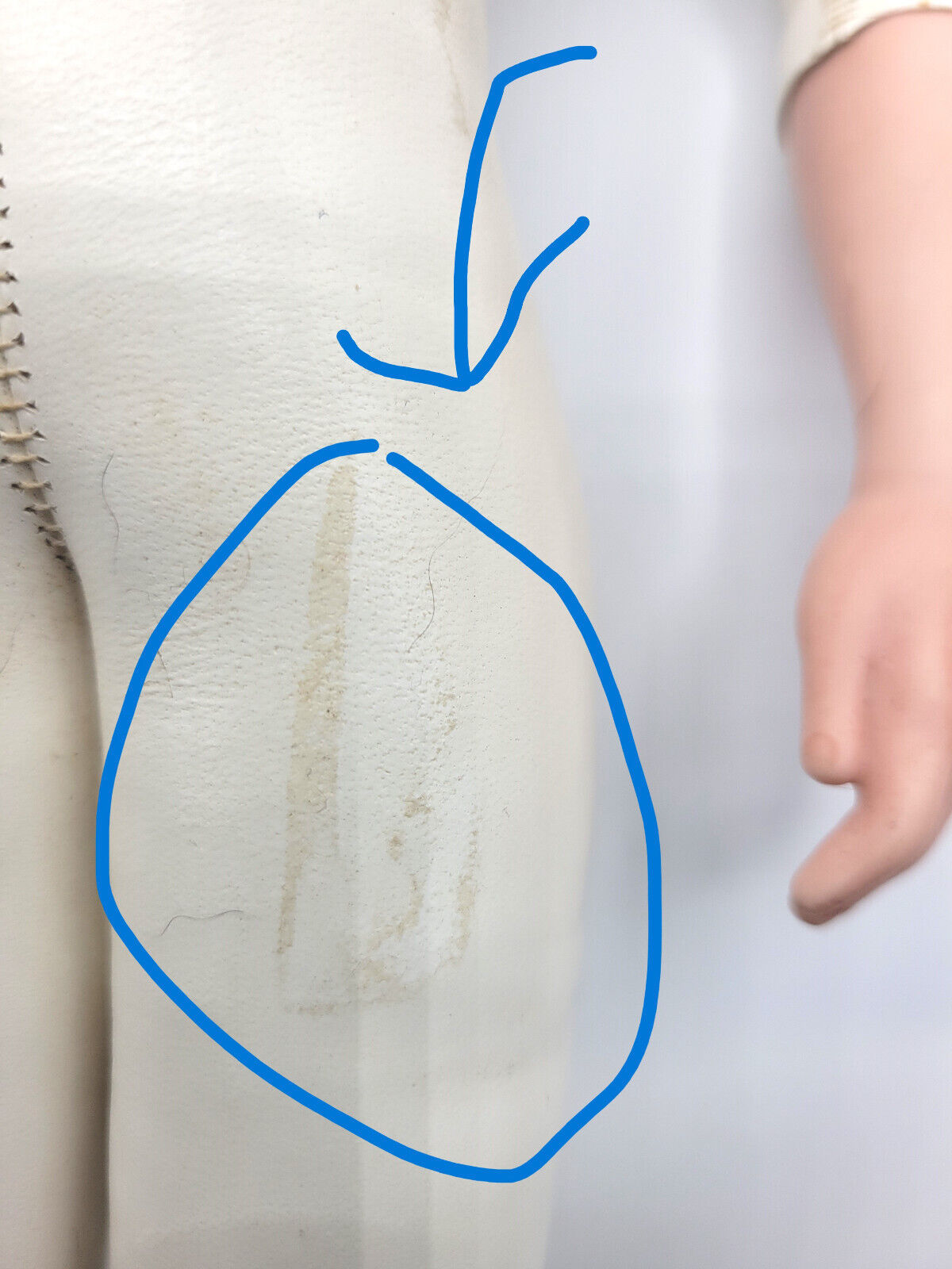 He has a jointed mans body, having a bisque shoulder plate/head, arms legs. He has beautiful light brown hand painted eyes, expressive face with curly hair. Mouth closed with a slight smile. His lovely man body is made of very pliable white leather.