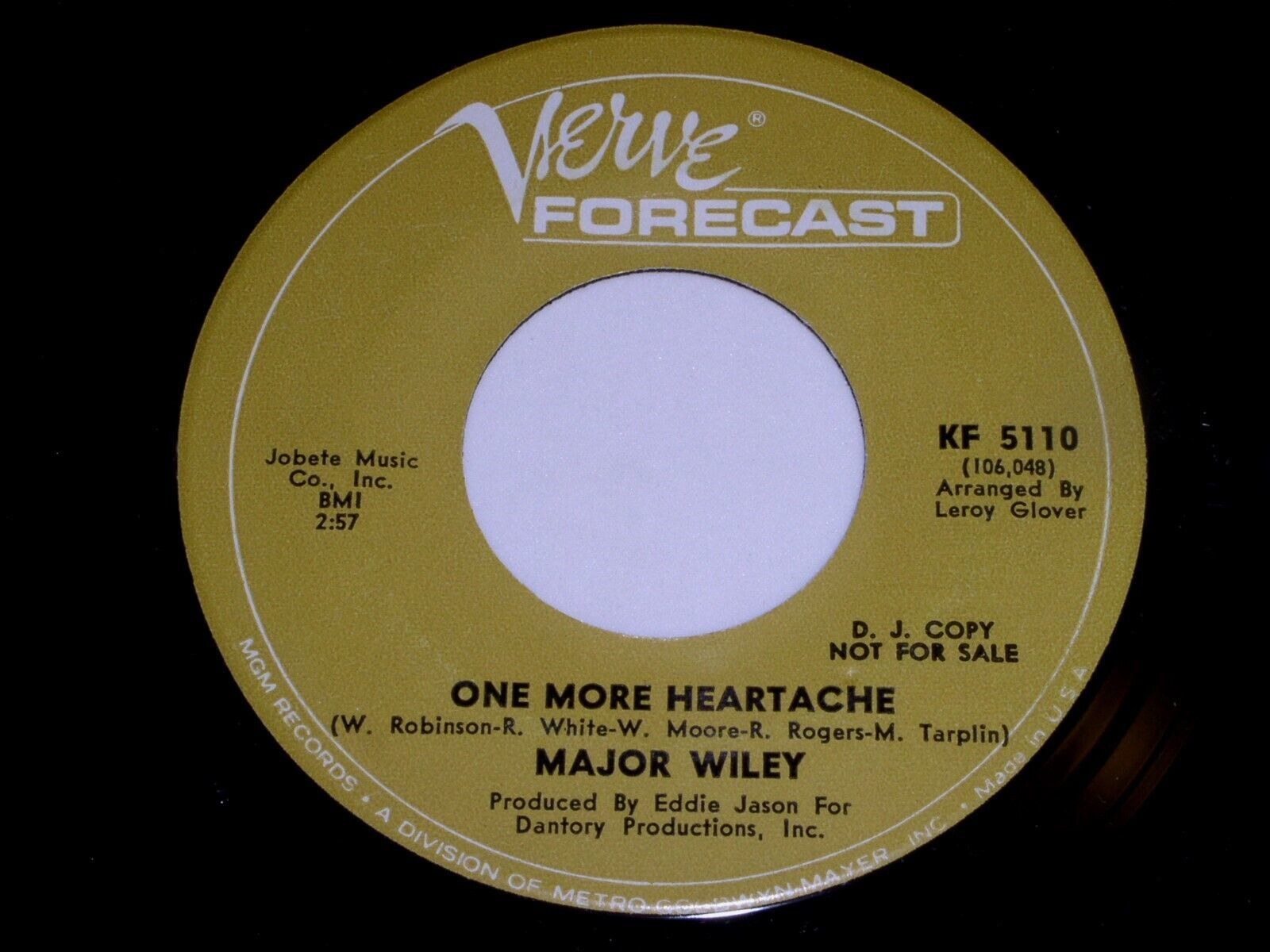 This is a vintage promotional 45 rpm phonograph record by Major Wiley, entitled, "One More Heartache". Flipside: "Rockin' Chair". Record label: Verve Forecast KF 5110.