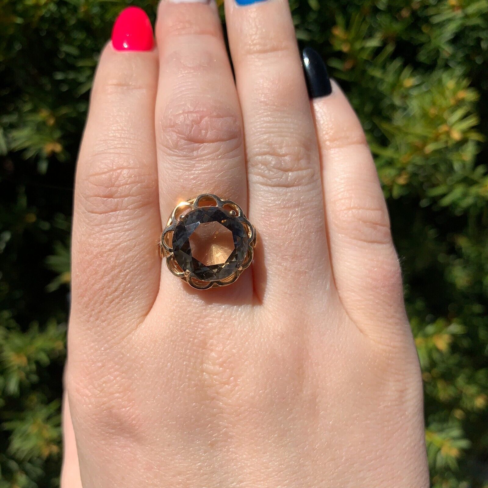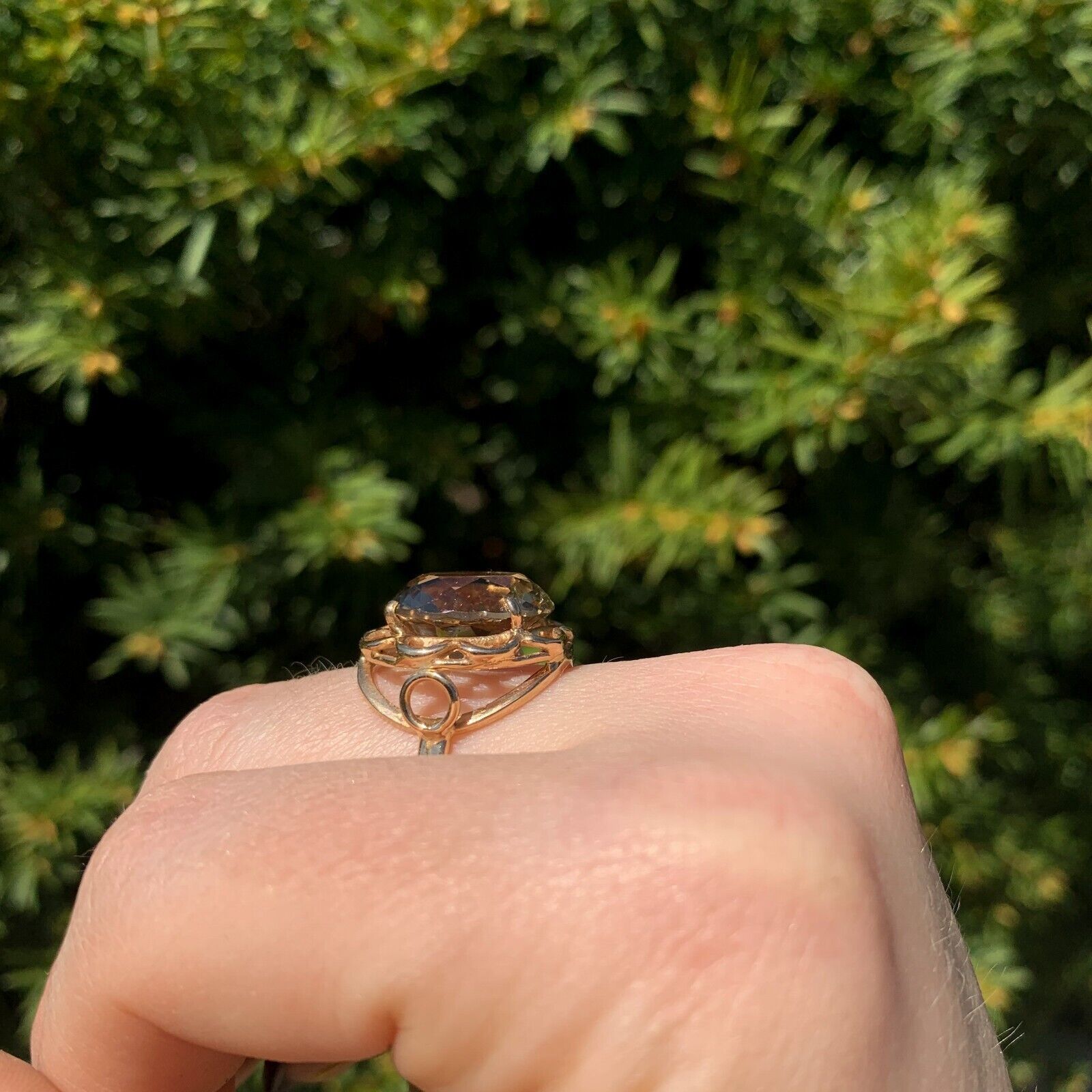 18k and 14k Rose gold ring with a large round brilliant cut smoky quartz. The quartz has a lighter champagne color and measures about 14.3mm. The ring has a hand wrought wire work shank. The ring is a size 8 and weighs 4.48 dwt. It dates from the 1950s. Stunning!