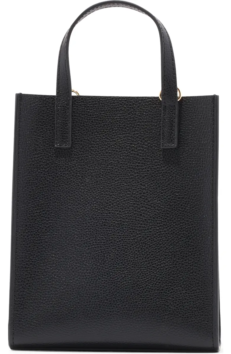 Gleaming lock and key charms and a pebbled leather exterior define this scaled-down tote with a sleek and sophisticated style.