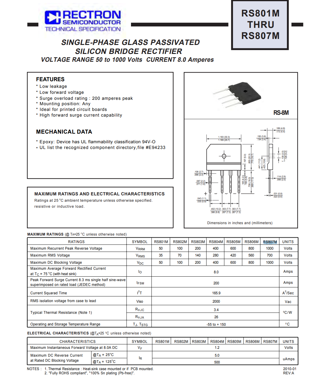 RS807M RECTRON Single Phase 1000V 8A Bridge Rectifier RS-8M 30x20x5mm