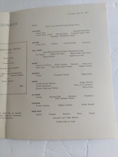 Indulge in a piece of history with this vintage R.M.S Queen Mary Dinner Menu from May 23, 1957. This collectible item comes from the United States and is a wonderful addition to any paper or menu collection. With its elegant design and Cunard branding, this menu is a true gem for fans of ocean liners and vintage travel. Whether you display it in your home or office, this menu is sure to be a conversation starter and a cherished possession for years to come.