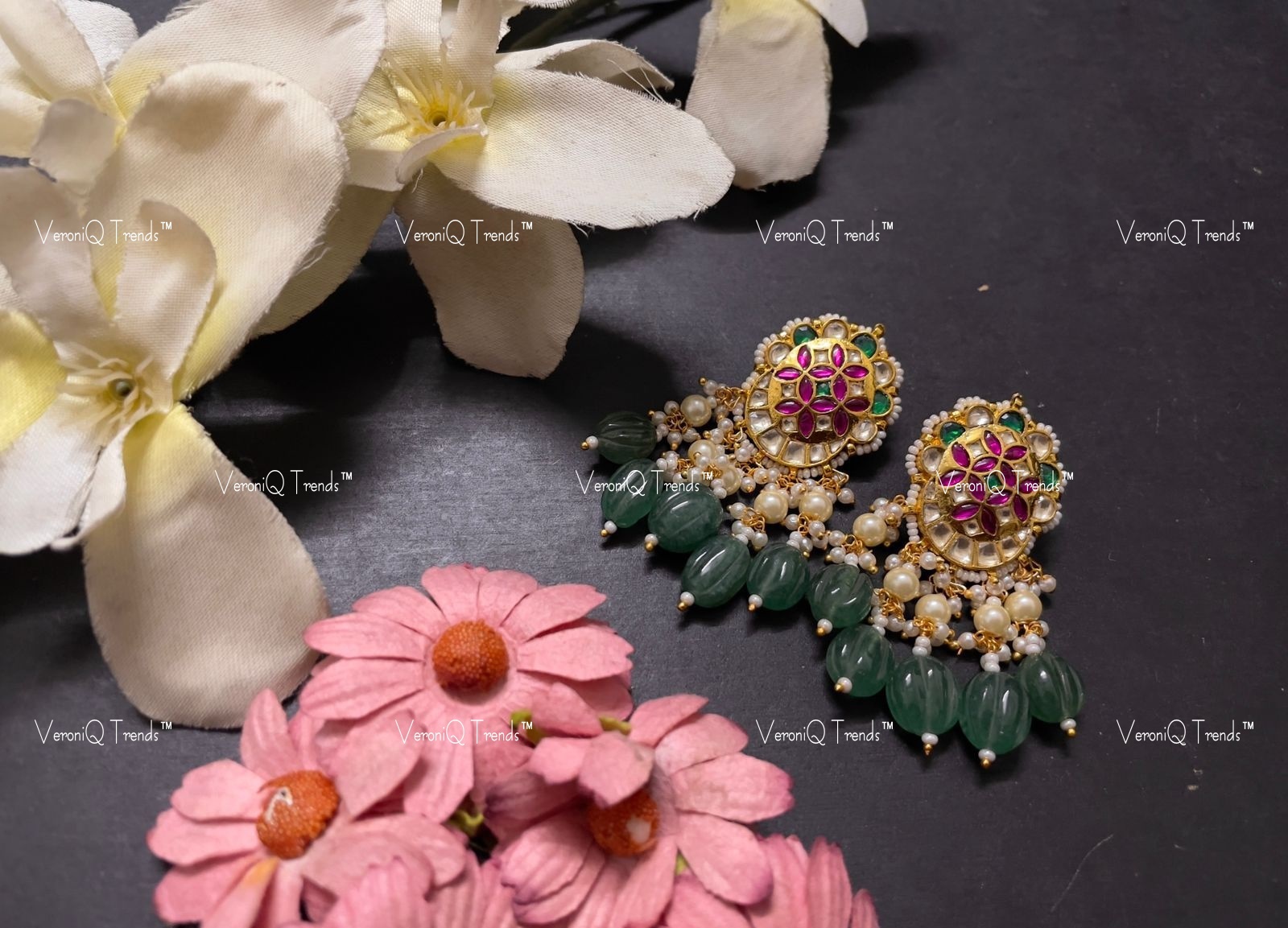 All our jewelry is handcrafted and therefore variations may occur. This earring is handcrafted in Brass with gold plating, studded with Pachi Kundan Stones Setting with Kemp Stone.