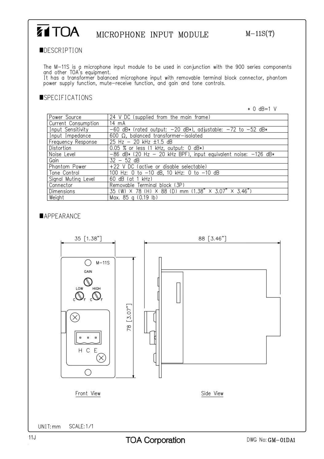 The M-11S is a microphone input module to be used in conjunction with the 900 series components and other TOA's equipment. Is has a transformer balanced microphone input with removable block connector, phantom power supply function, mute-receive function, and gain and the controls.