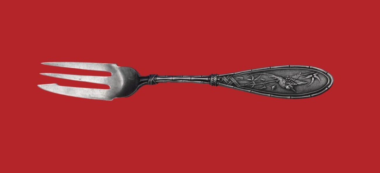 Sterling silver Pastry Fork 3-tine 6 1/8" (or Old Fashioned Pickle Fork) in the multi-motif bird pattern Japanese aka New Japanese by Whiting. It is not monogrammed and is in excellent vintage condition.