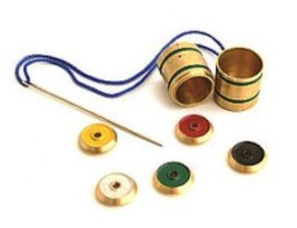 Five colored brass disks are displayed. The spectator is asked to flip the disks over and mix them up, hiding the different colors. The spectator selects a disk and is asked to place all disks in the container. The container is sealed and a string is run through the center. Magically, the performer is able to make the selected disk escape from the string of disks and drop out of the chamber!
