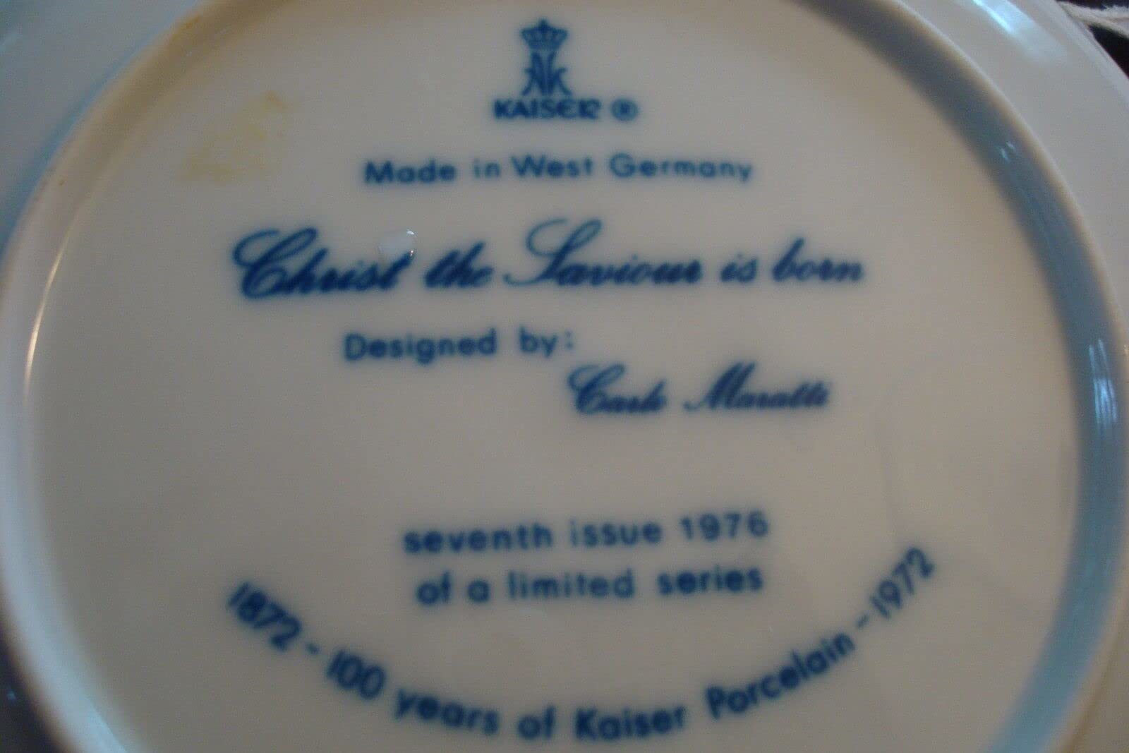 Kaiser Christmas 1976 Plate, made in Germany, "Christ the Savior is Born", 6" diameter, no original box or certificates, very good condition. Some light surface scratches commensurate with age.