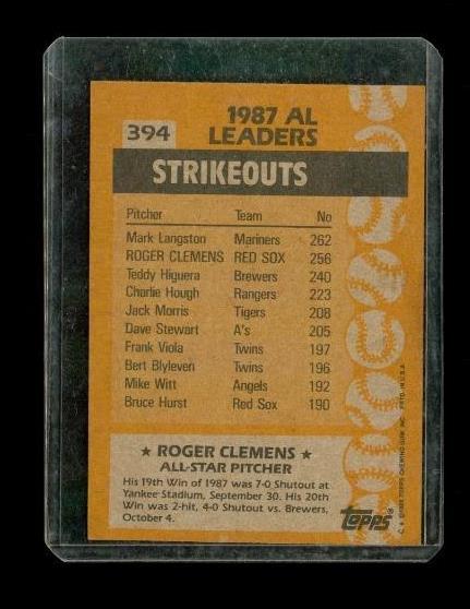 1988 Topps Roger Clemens Baseball Card 394 Boston Red Sox All Star American