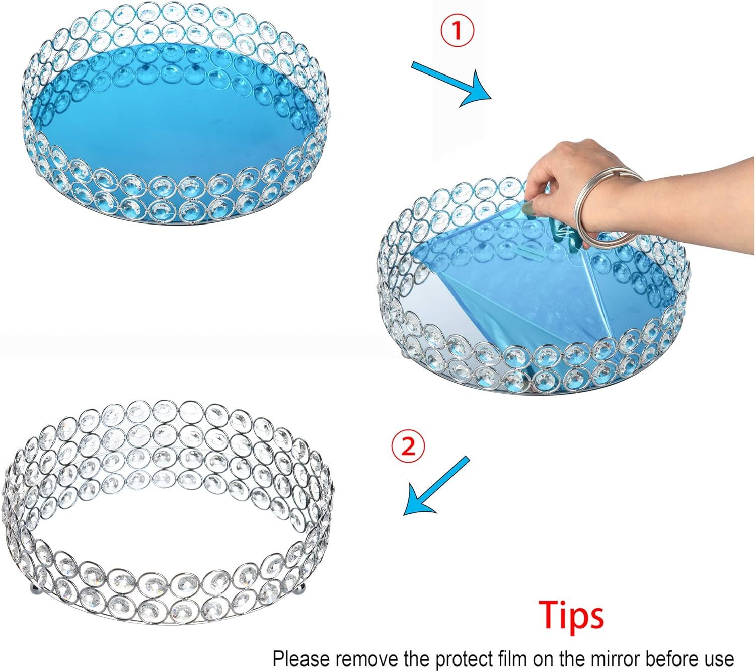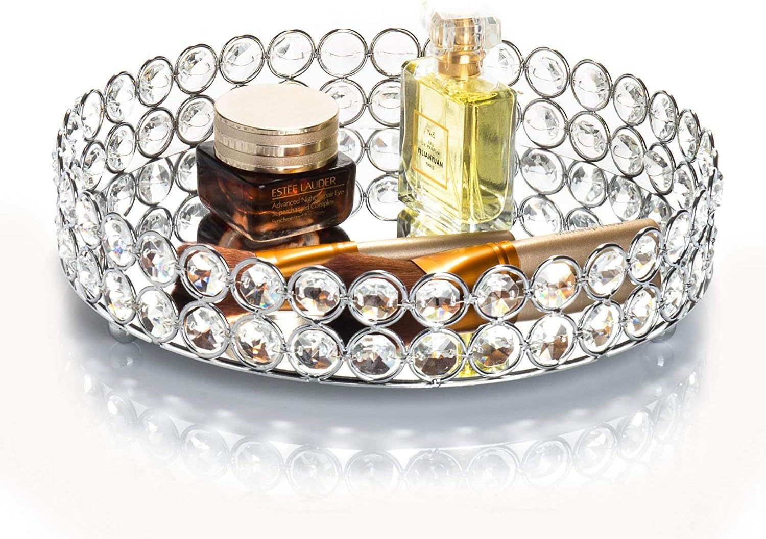 Crystal Makeup Tray Material: Crystal beads with Mirrored surface (please remove the Protective Film on the mirror surface when using the tray) Vanity Tray Measures: Diameter: 10 x 10 inches / 25 x 25 cm; Height: 1.57 inch/ 4cm; Net Weight: 1.42lb/ 648g Exquisite Crystal: Handcraft Premium Crystal with multiple sections distribute flame?s effects more dazzling. Two Layer beads, Mirrored surface tray with stunning base. Durable Decorative Tray Organizer: Organize Jewelry, Vanity, Cosmetic, Makeup Brush, Perfume Bottles, Flower vase or Serving drinks etc. Multipurpose: Suitable for Decorating Dresser Tray, Display Jewelry Tray, Serving Tray in the Party, Wedding Centerpieces, Bathroom Vanity Tray Organzier.
