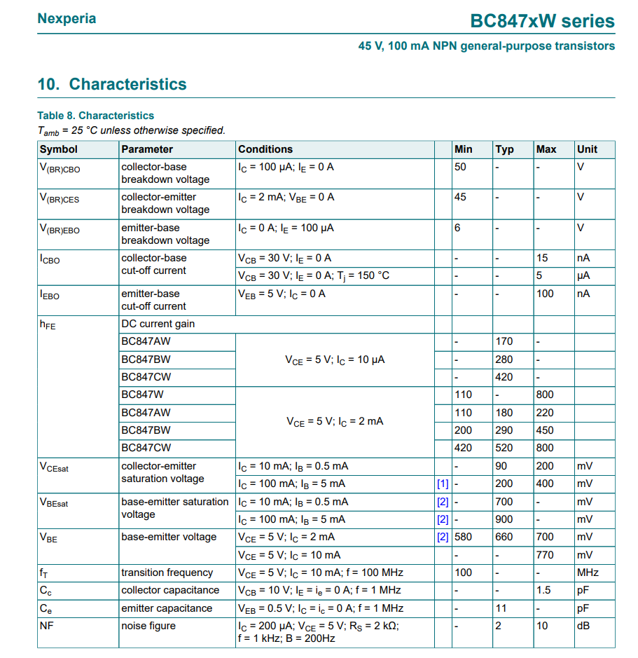 BC847CW Nexperia NPN Transistor 45V 100mA 150mW BJT SC-70
