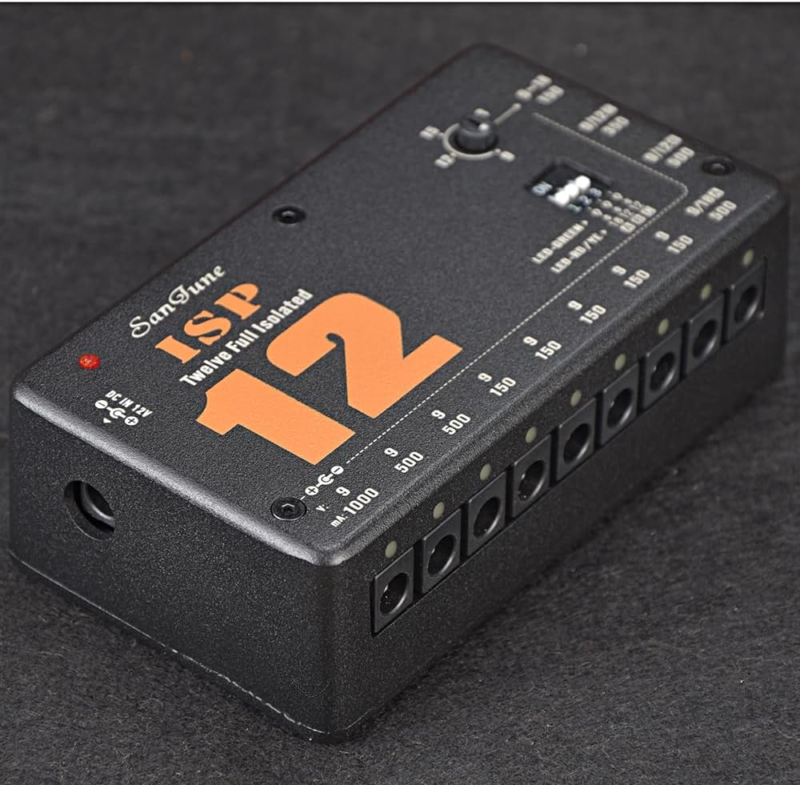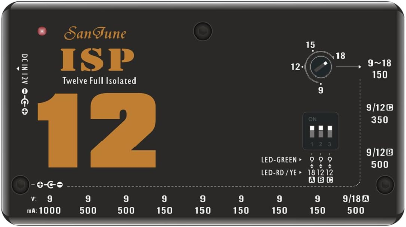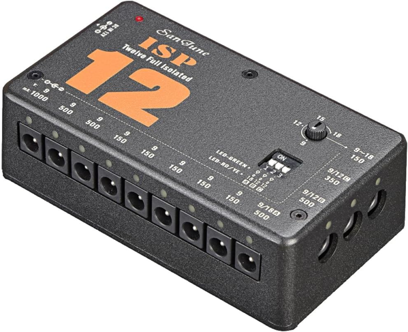 12 ISOLATED OUTPUTS: Each output of the ISP12 Guitar Pedal Power Supply is fully isolated, which includes 1 x 9V 1000mA, 2 x 9V 500mA, 5 x 9V 150mA, 1 x 9/18V 500mA, 2 x 9/12V 350mA 500mA, 1 x 9V~ 18V 350mA