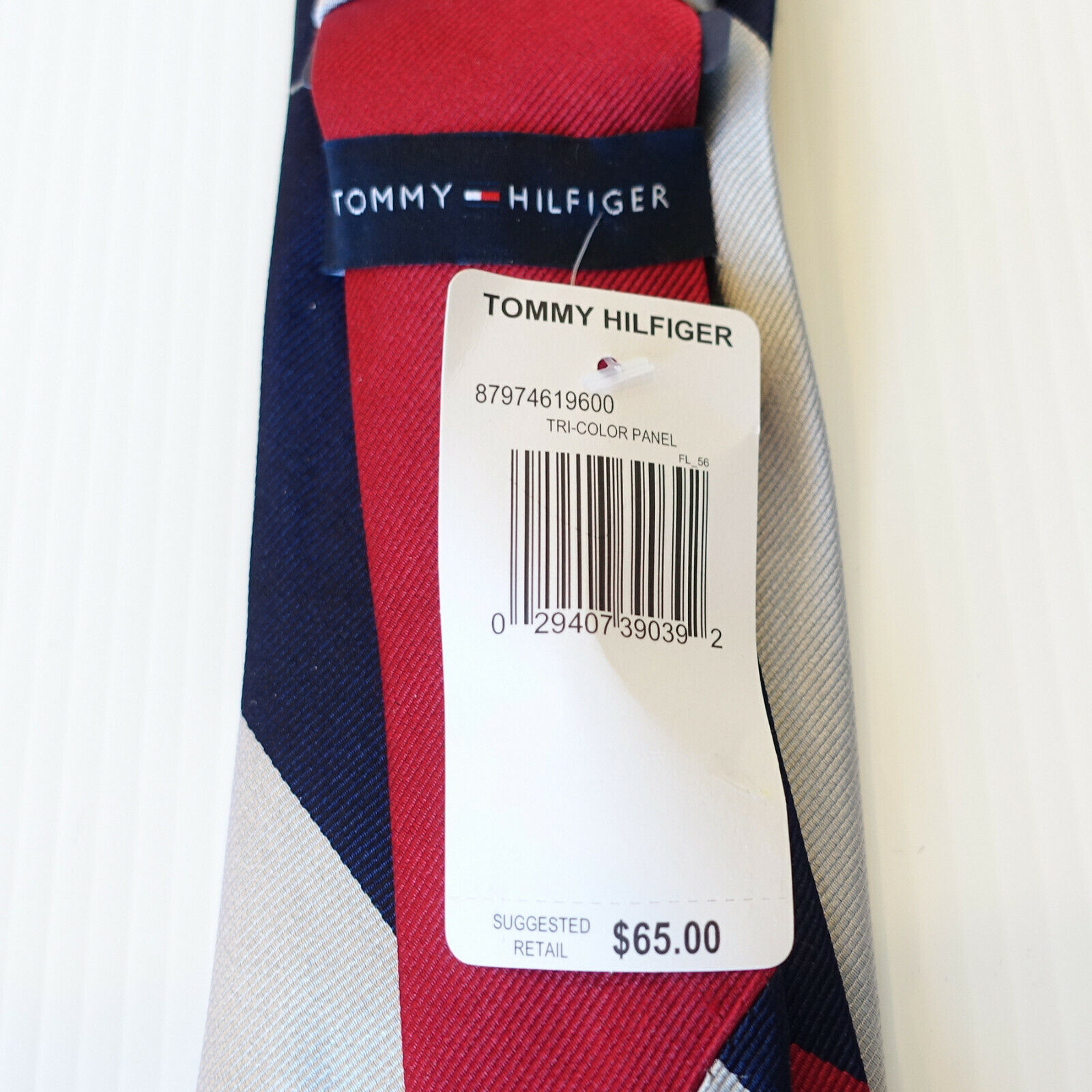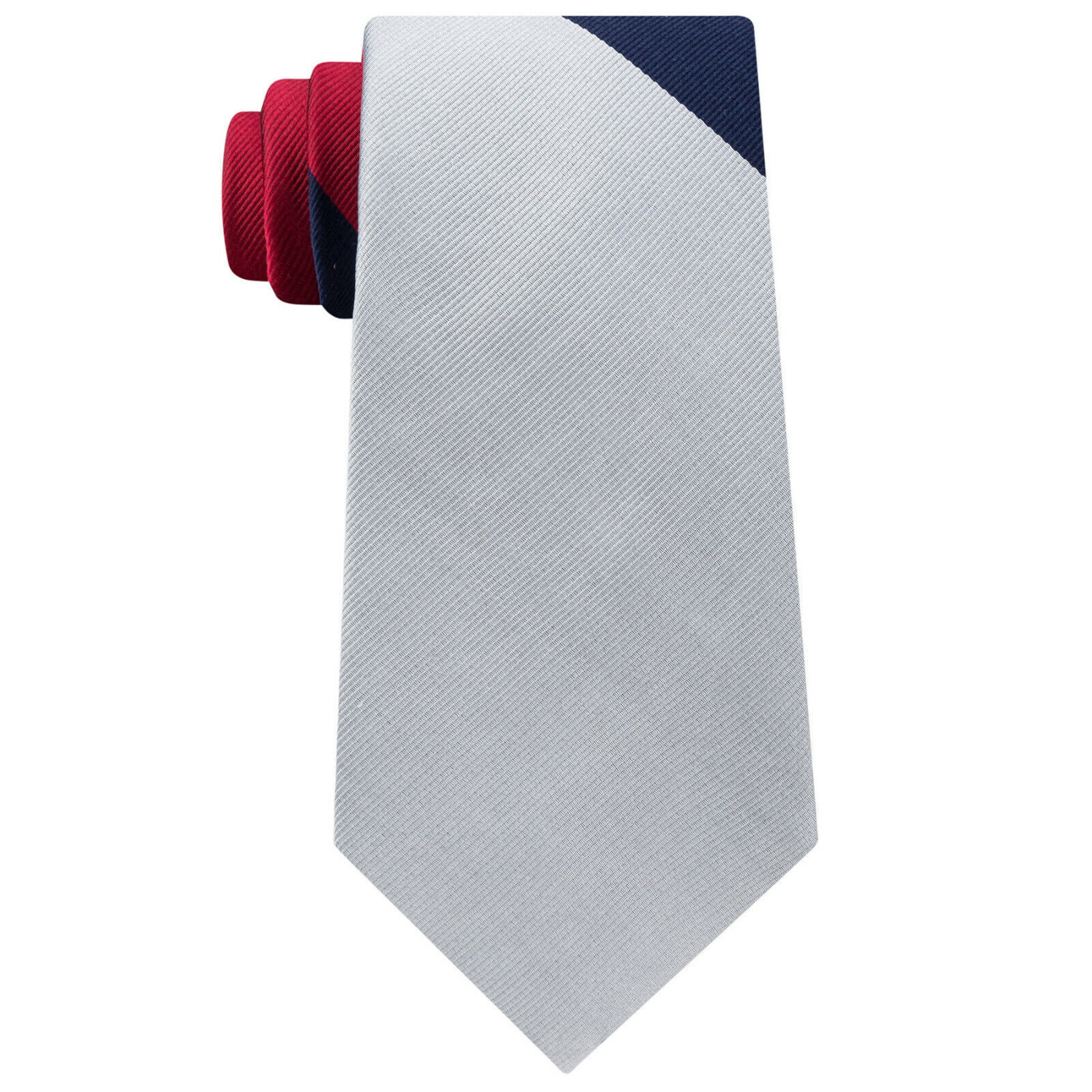 TOMMY HILFIGER Red Navy Blue Silver Gray Tri-Color Panel Silk Twill Classic Tie